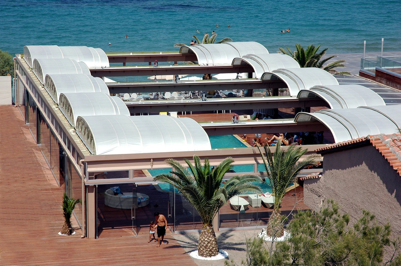 Möjliggör simning från vår till höst – taket säkerställer gästernas komfort även utanför högsommaren. -