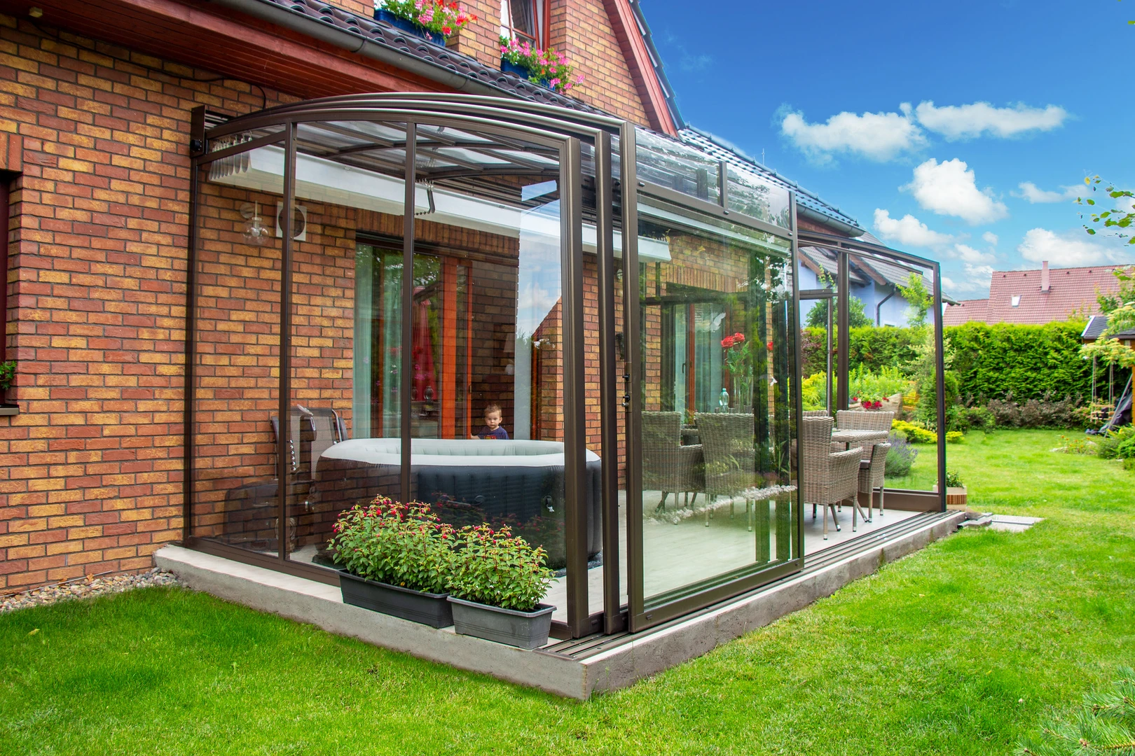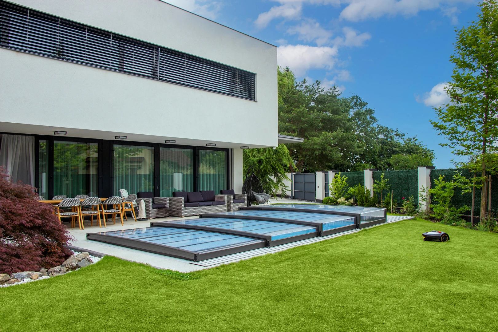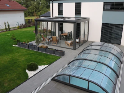 Takkonstruktionerna är gjorda av högkvalitativa aluminiumprofiler som kräver minimalt underhåll och säkerställer lång hållbarhet. Transparenta polykarbonatfyllningar i pooltaken ger en perfekt utsikt över poolområdet. För terrastak garanterar de gott om naturligt ljus på terrassen och i angränsande rum under hela året. Våra tak är kända för högsta kvalitet, elegant design och hållbarhet.