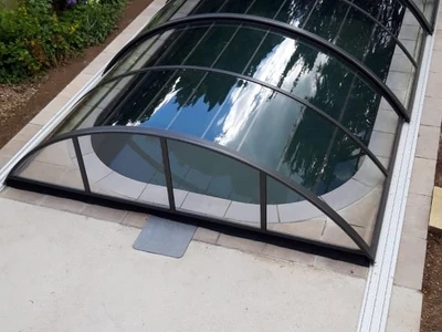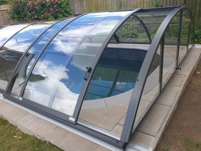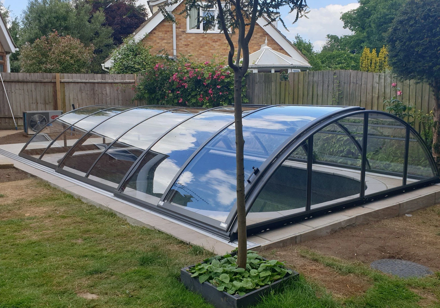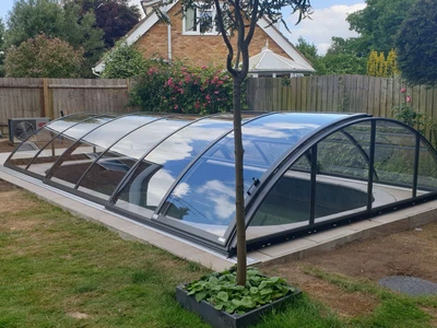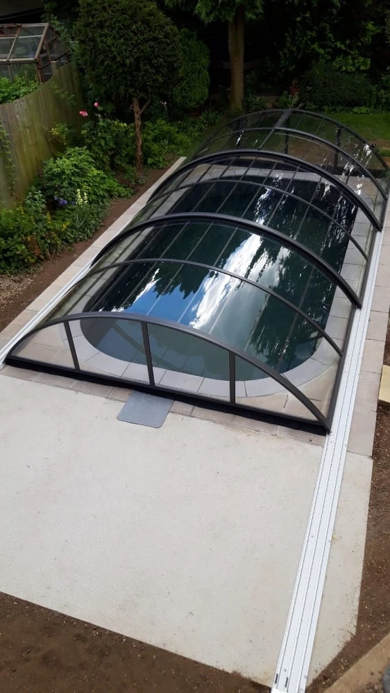 Azure Compact är utformad för att erbjuda en bekväm innertakshöjd utan att dominera trädgårdsutrymmet. Dess manuellt skjutbara segment möjliggör flexibel användning – helt öppet under varma, soliga dagar eller delvis stängt när vädret är mindre inbjudande. Claire uppskattade särskilt hur detta gjorde det möjligt för hennes familj att njuta av poolen under både vår och höst, inte bara på sommaren.