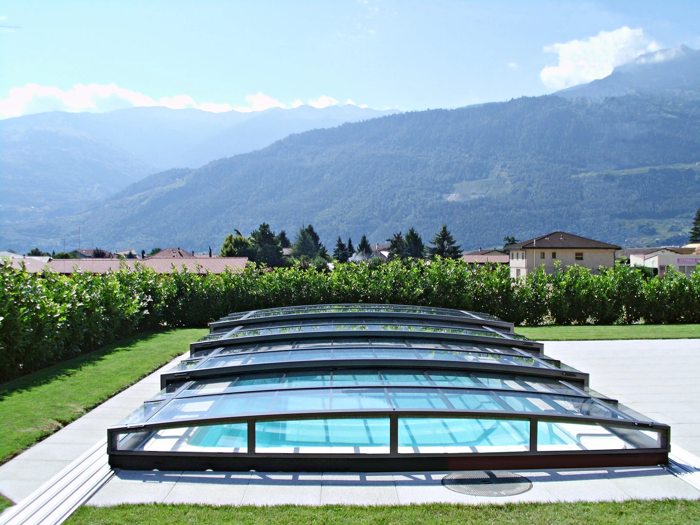 Pooltak CORONA™ är det lägsta dubbelspårssystemet, designat för att hålla poolen ren och varm utan att skymma utsikten över trädgården. Dess design kombinerar vertikala, mycket låga sidoväggar med en subtil båge, vilket säkerställer både funktion och estetik.