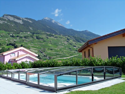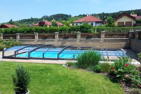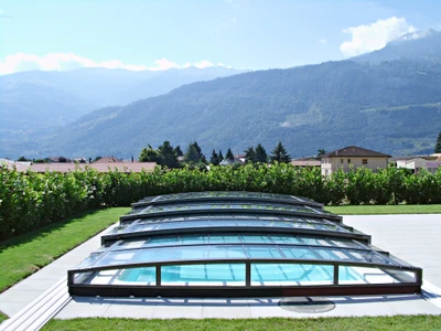 CORONA™ pooltak är en idealisk lösning för poolägare som söker ett lågt tak utan att kompromissa med kvalitet och funktionalitet. Modellen kännetecknas av sina vertikala, mycket låga sidoväggar som är förbundna med en mjuk båge. Tack vare detta skymmer taket inte utsikten över trädgården och smälter harmoniskt in i omgivningen.