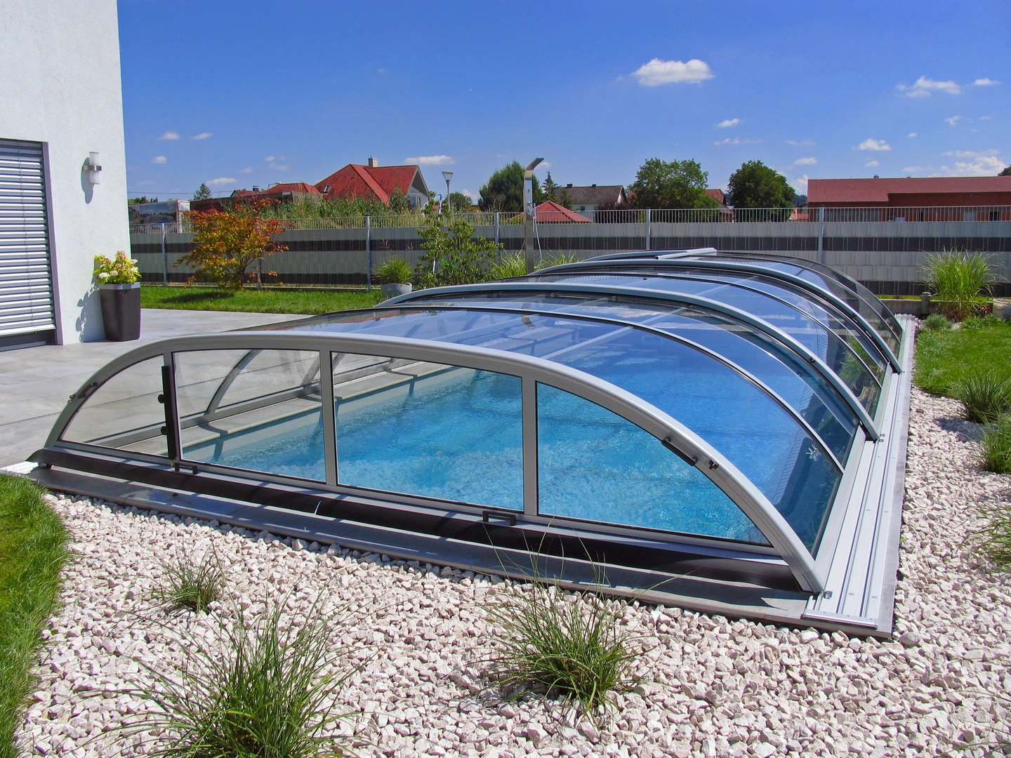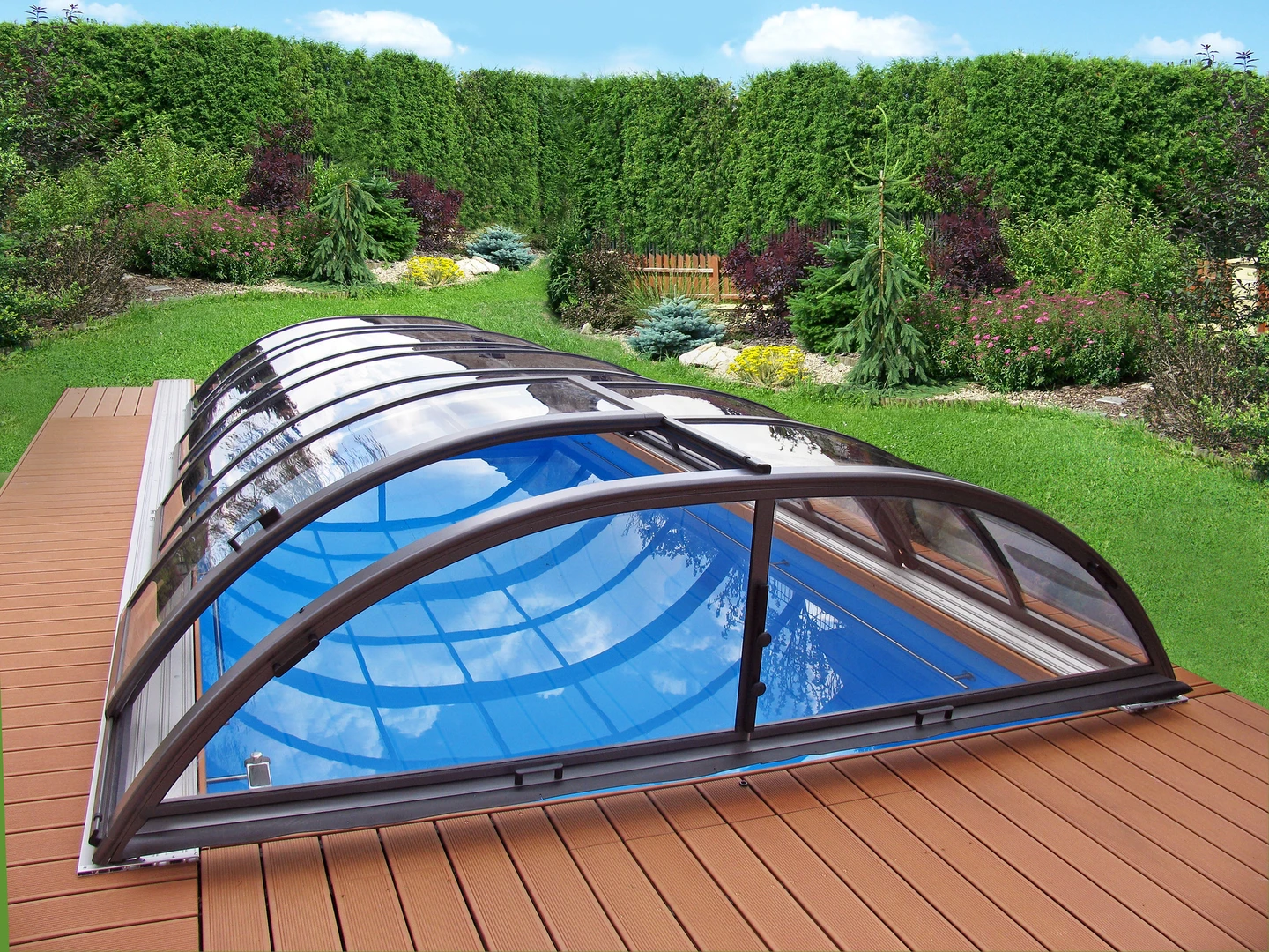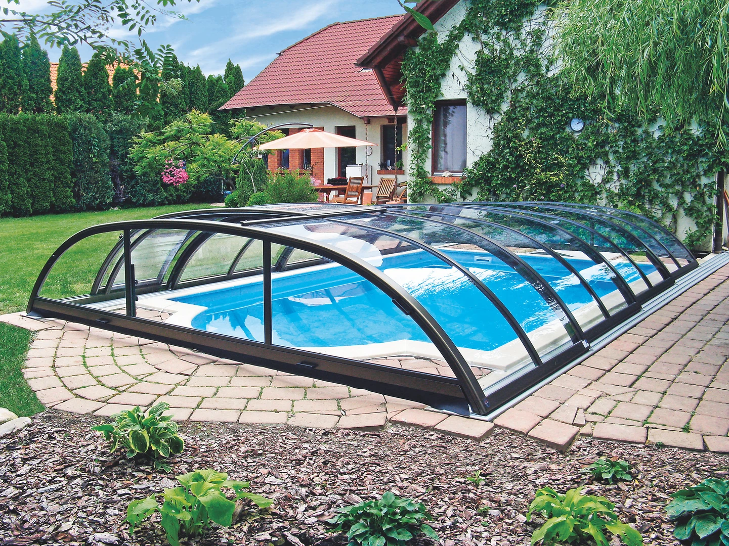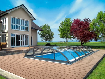 Pooltak ELEGANT NEO™ från Alukov erbjuder en elegant form och låg profil, som ger fullständigt skydd för poolen. Tack vare den optimala kurvan möjliggörs bekväm simning även i ogynnsamt väder, utan att trädgårdens utseende störs.
