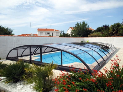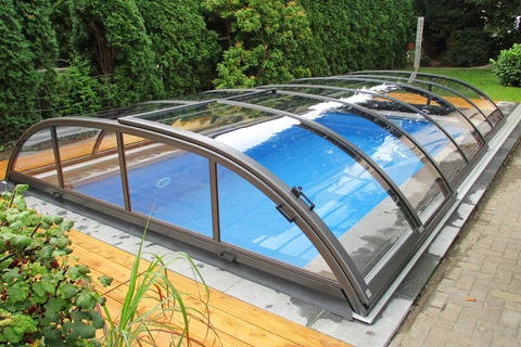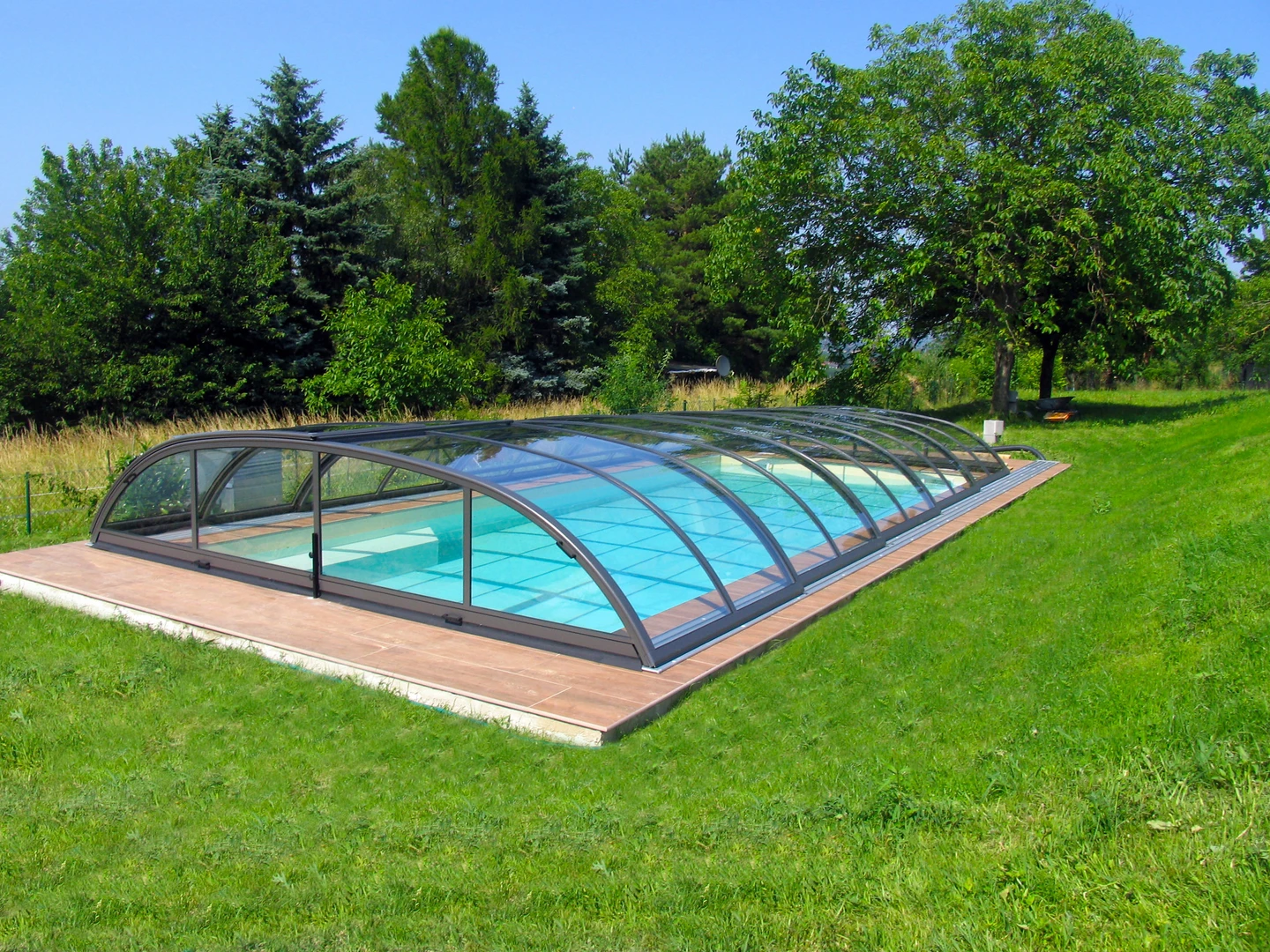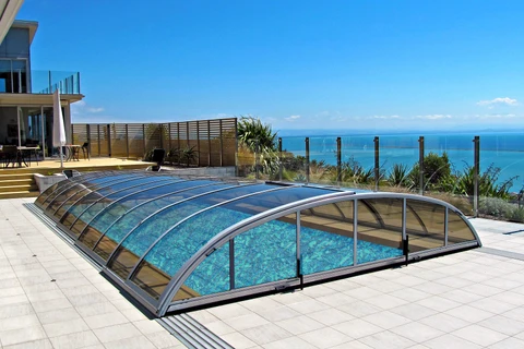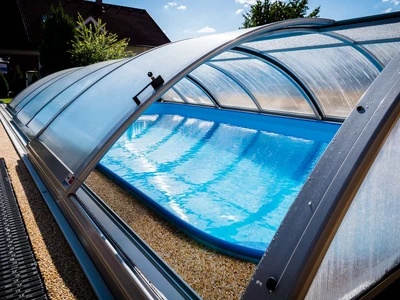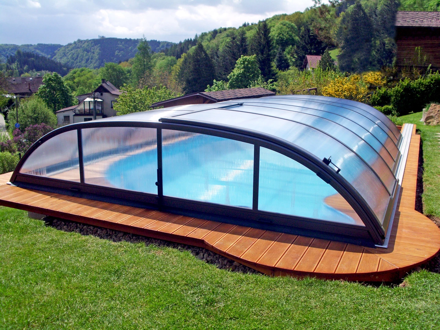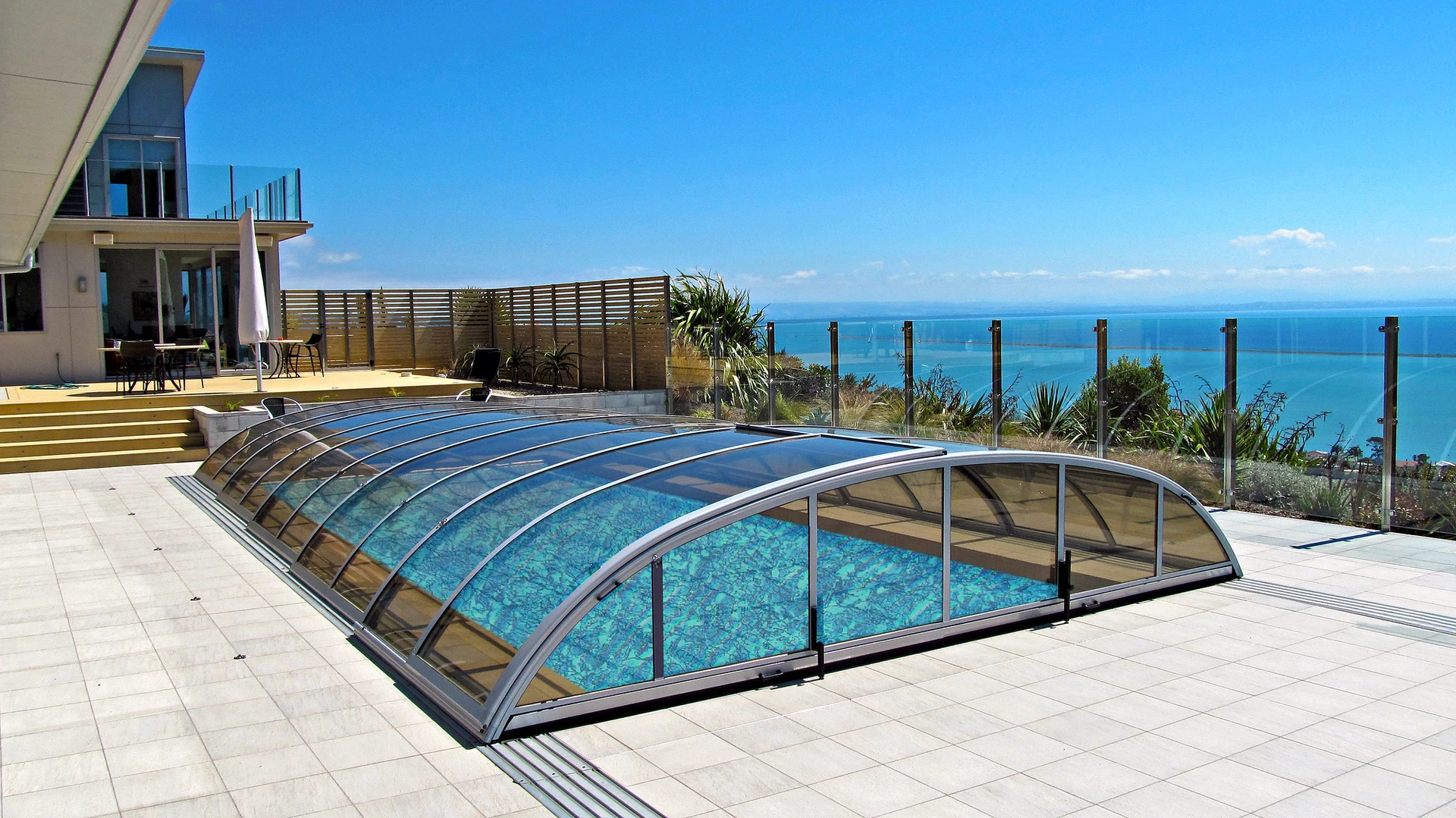 Pooltak ELEGANT NEO™ från Alukov erbjuder en elegant form och låg profil, som ger fullständigt skydd för poolen. Tack vare den optimala kurvan möjliggörs bekväm simning även i ogynnsamt väder, utan att trädgårdens utseende störs.