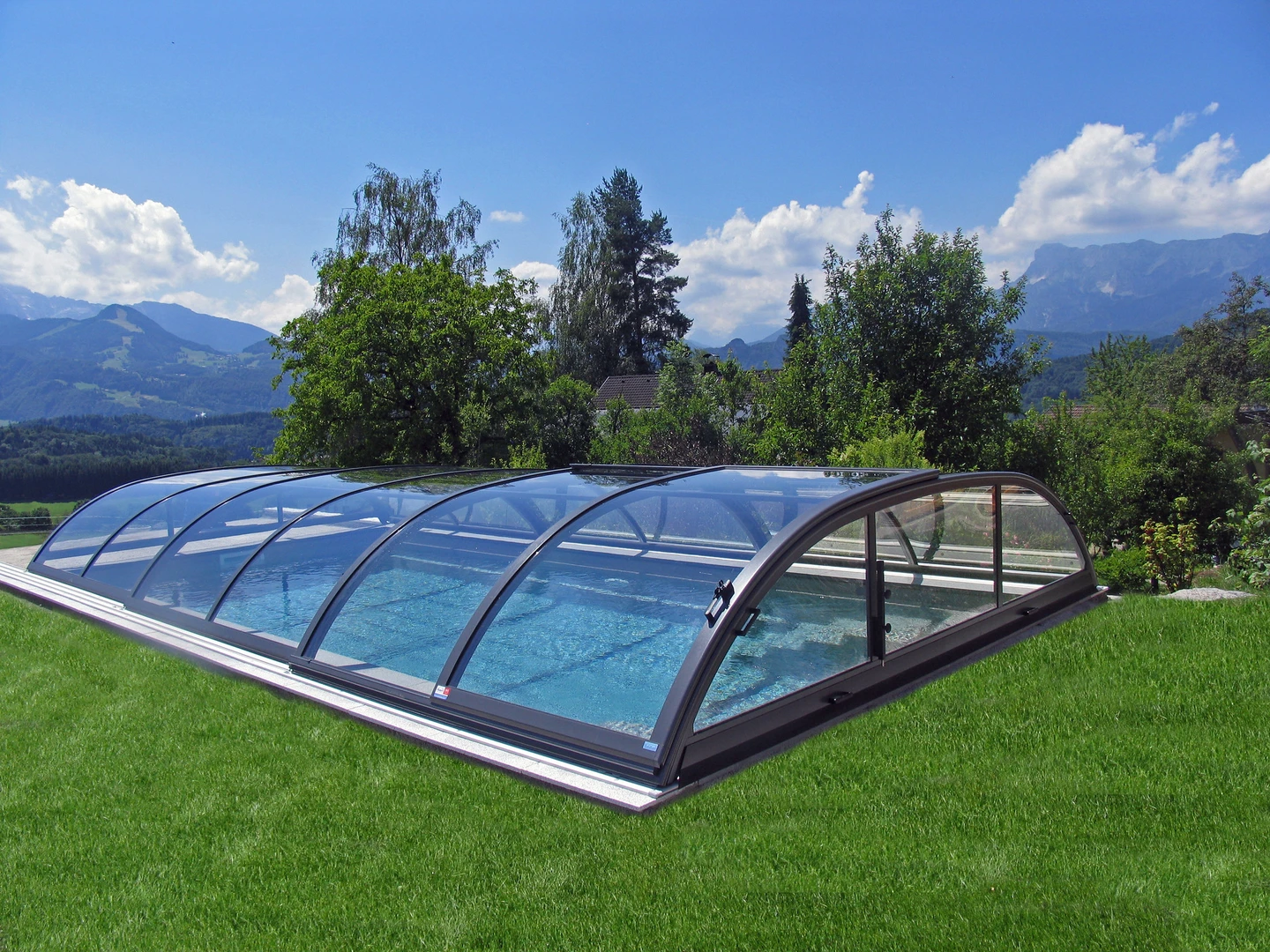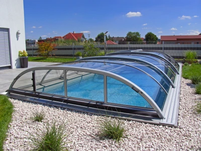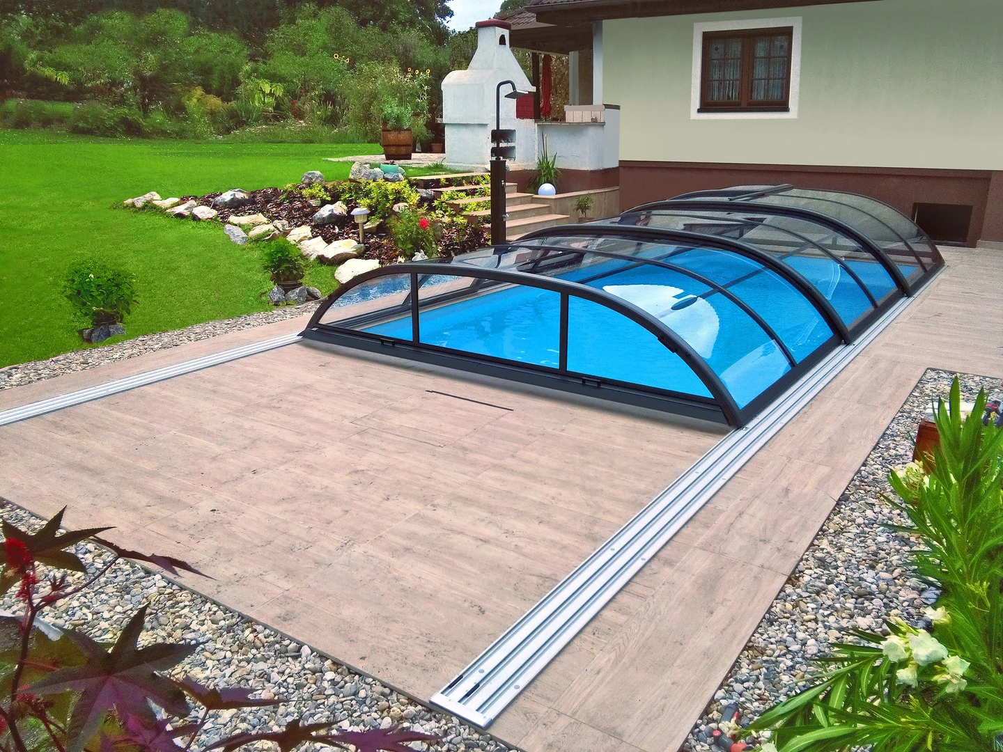 ELEGANT NEO™ pooltak representerar den perfekta kombinationen av funktionalitet och estetisk design. Den eleganta formen och den låga profilen gör att taket naturligt smälter in i omgivningen utan att störa trädgårdens helhetsintryck. Trots den låga höjden ger det tillräckligt utrymme för bekväm simning även vid sämre väder.