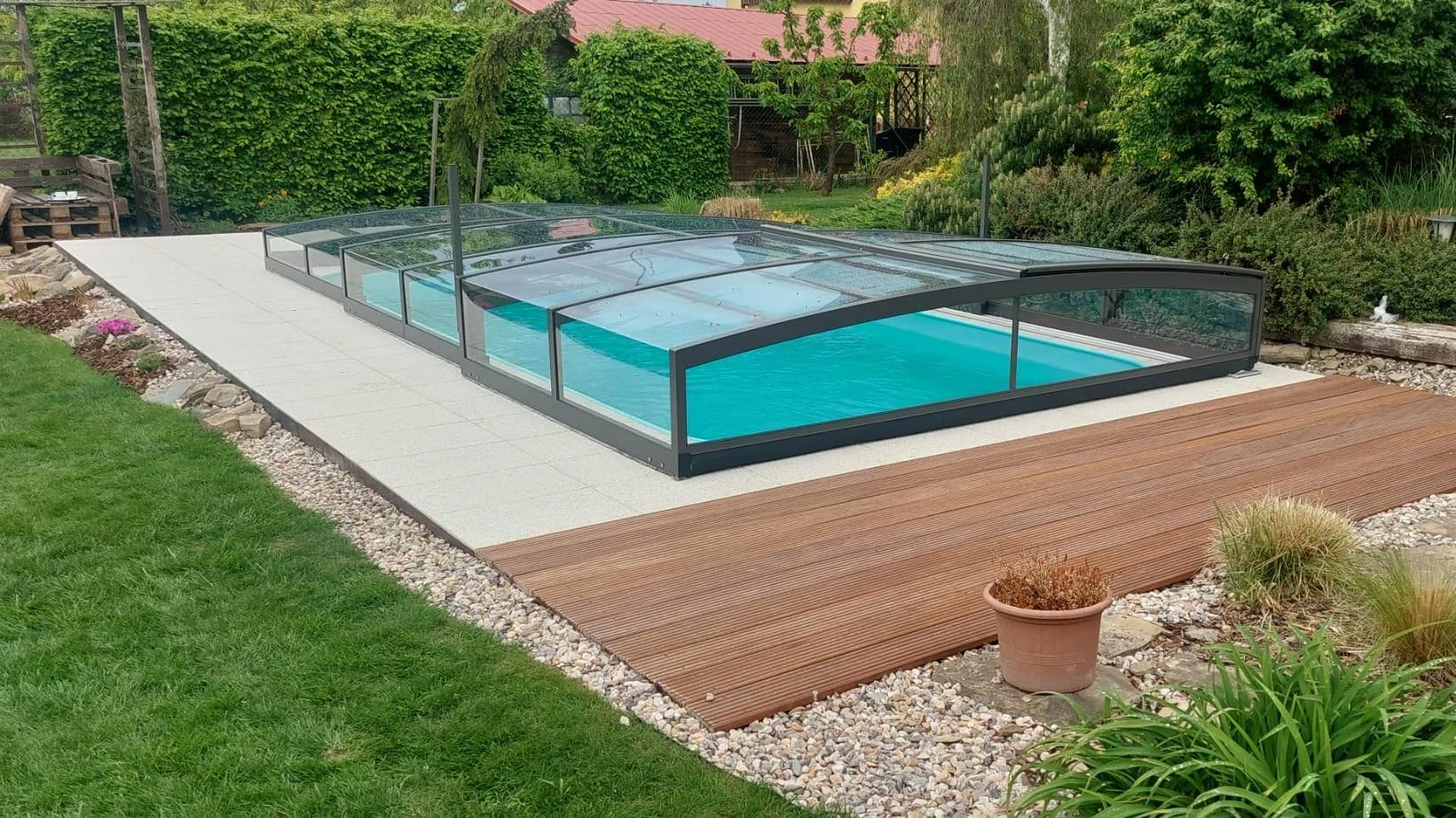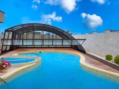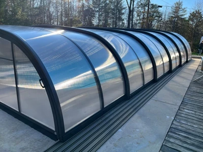 Transparenta polykarbonatpaneler ger fri sikt över poolen även när taket är stängt och förstärker den visuella kontakten med vattenytan. Säkerhetslåset förhindrar att taket öppnas av misstag eller blåser upp vid plötsliga vindbyar när du inte är på plats, vilket skyddar både pool och omgivning.
