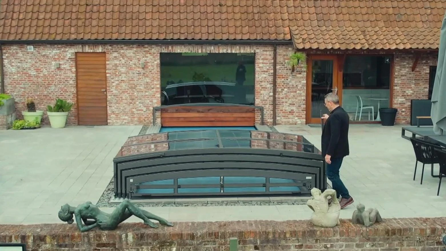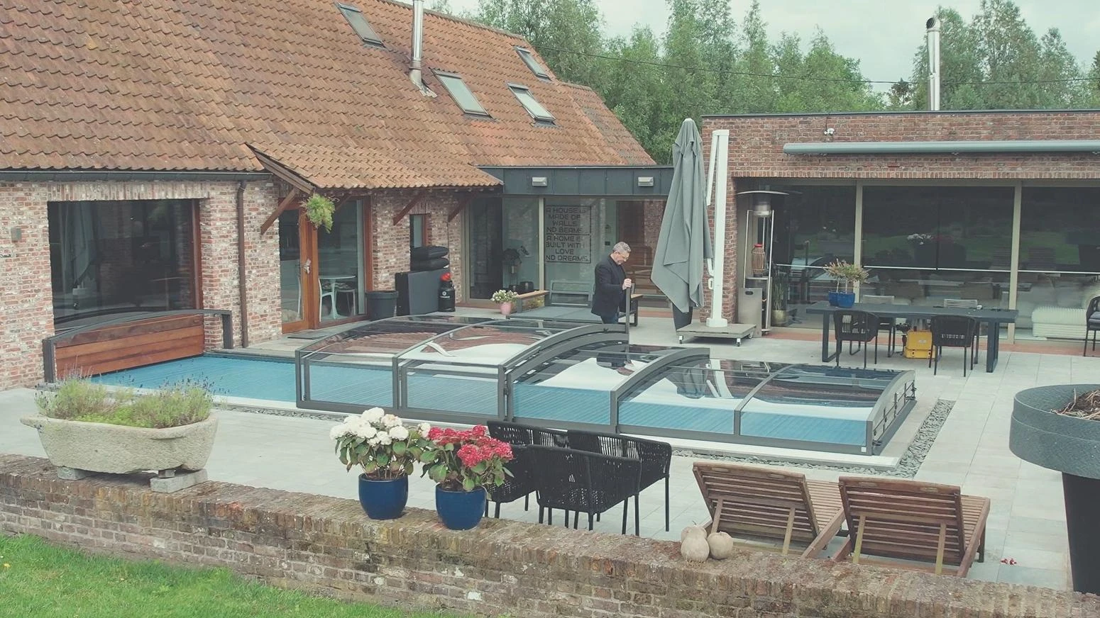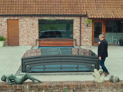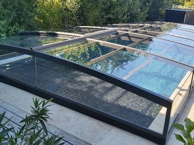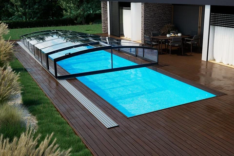 PARADE pooltak är en modern teleskoplösning med lättviktskonstruktion och enkelspårssystem. Dess transparenta paneler ger poolutsikt även när det är stängt, medan säkerhetslås förhindrar obehörig åtkomst.