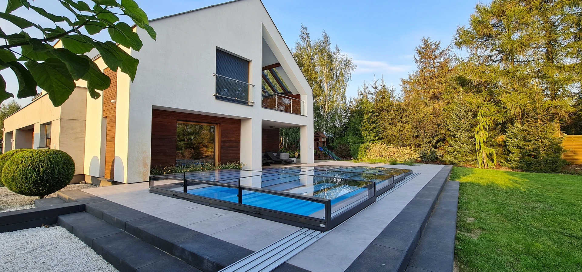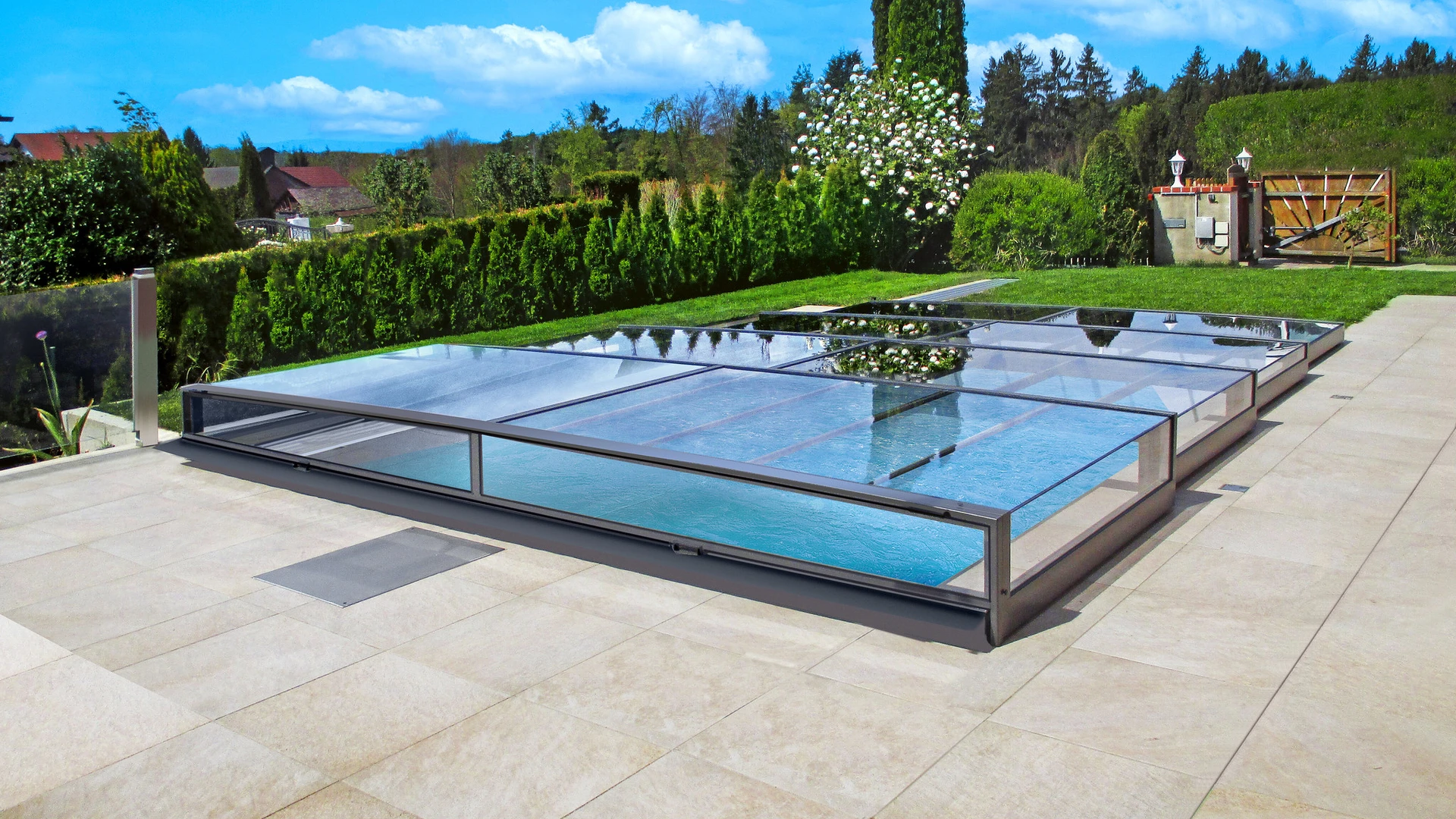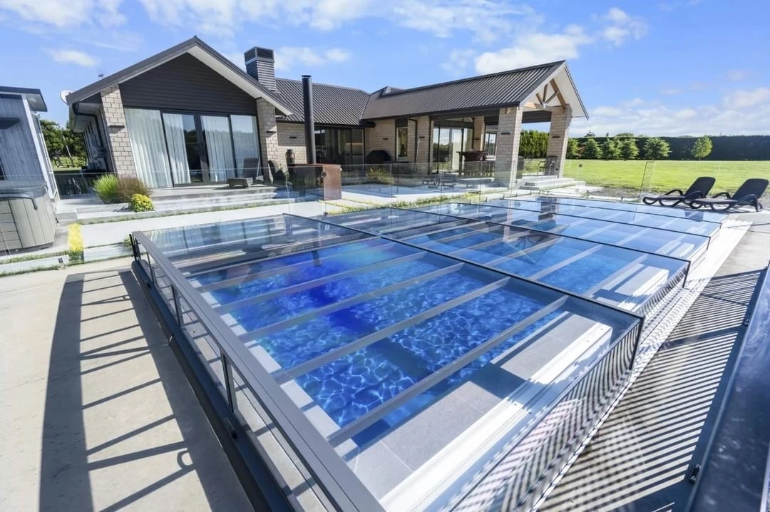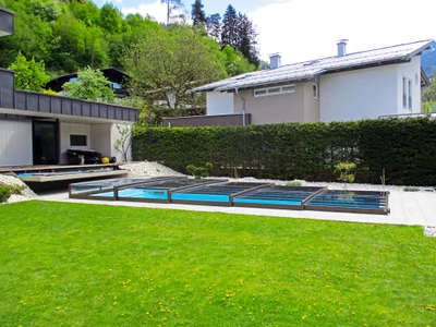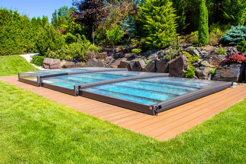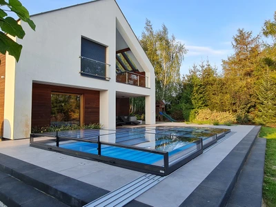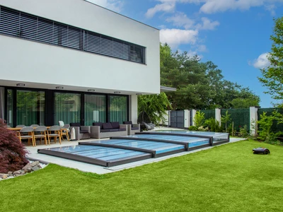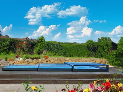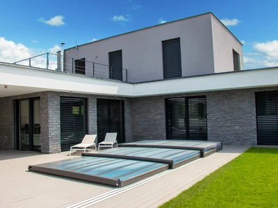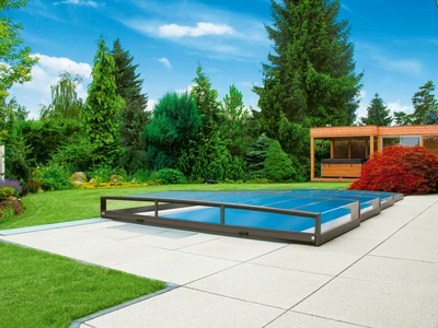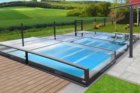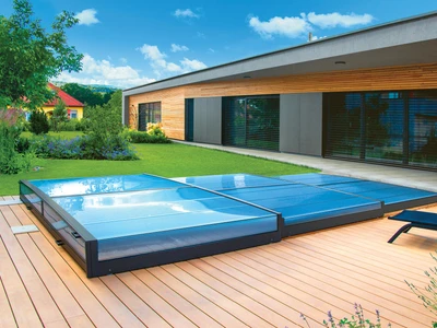 Pooltak VIVA™ från Alukov är en lågprofils-lösning med enkelspårssystem som möjliggör barriärfri åtkomst från tre sidor. Den moderna designen skyddar poolen från smuts, påskyndar uppvärmningen av vattnet och bibehåller temperaturen över natten.