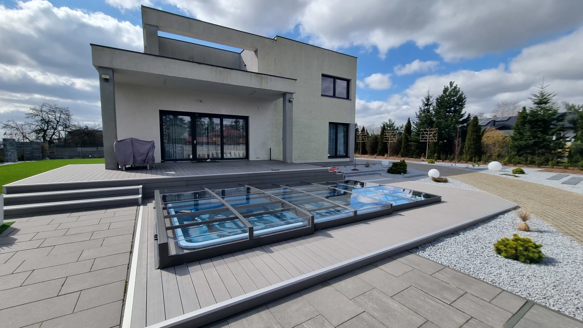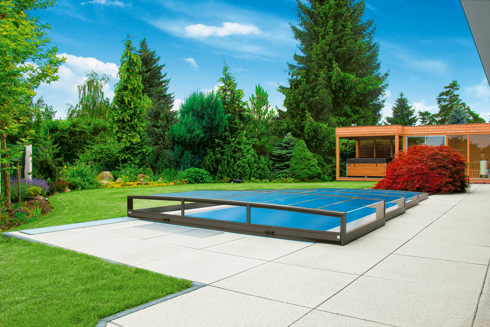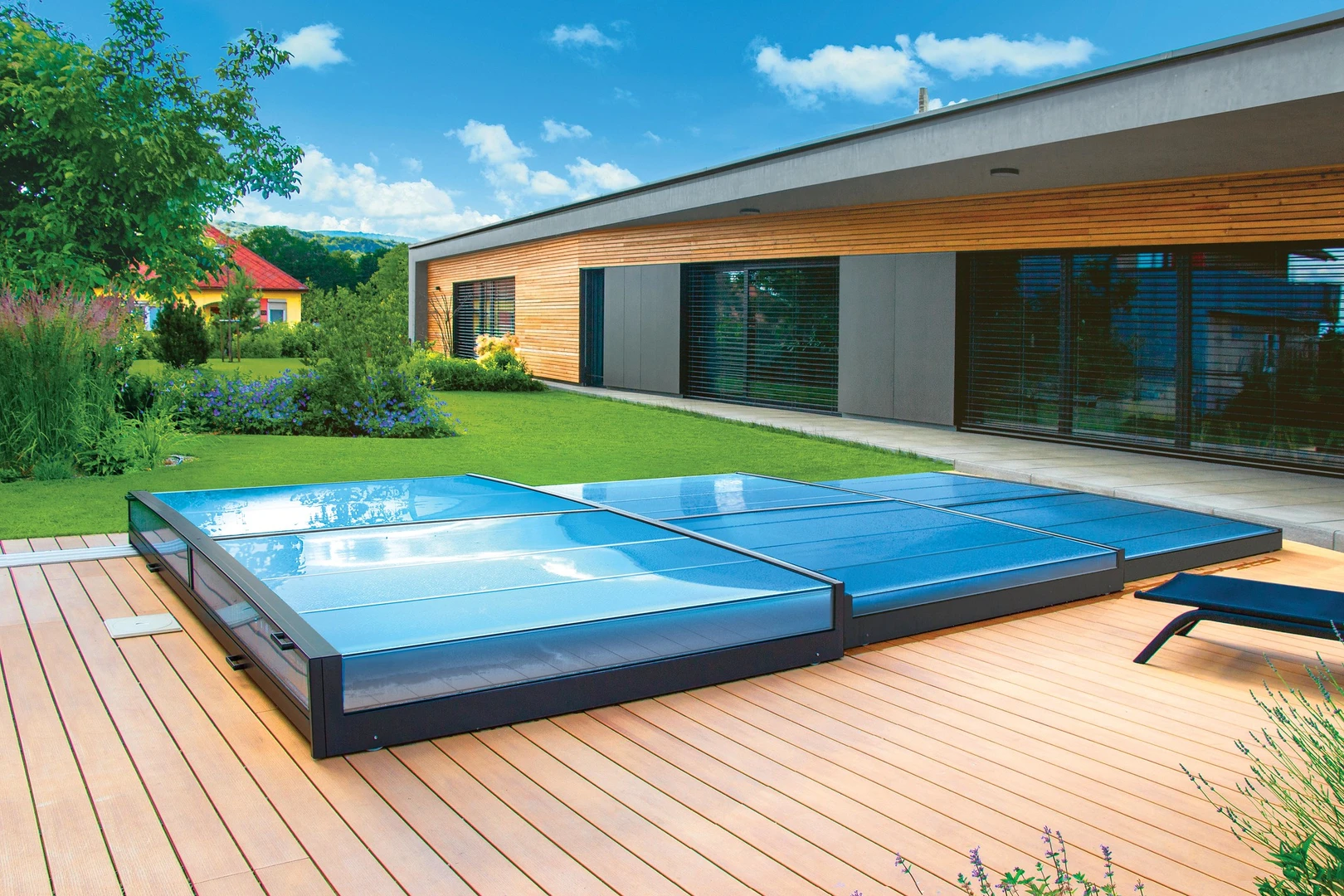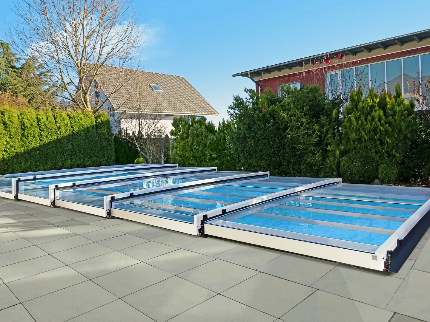 Pooltak VIVA™ från Alukov är en lågprofils-lösning med enkelspårssystem som möjliggör barriärfri åtkomst från tre sidor. Den moderna designen skyddar poolen från smuts, påskyndar uppvärmningen av vattnet och bibehåller temperaturen över natten.