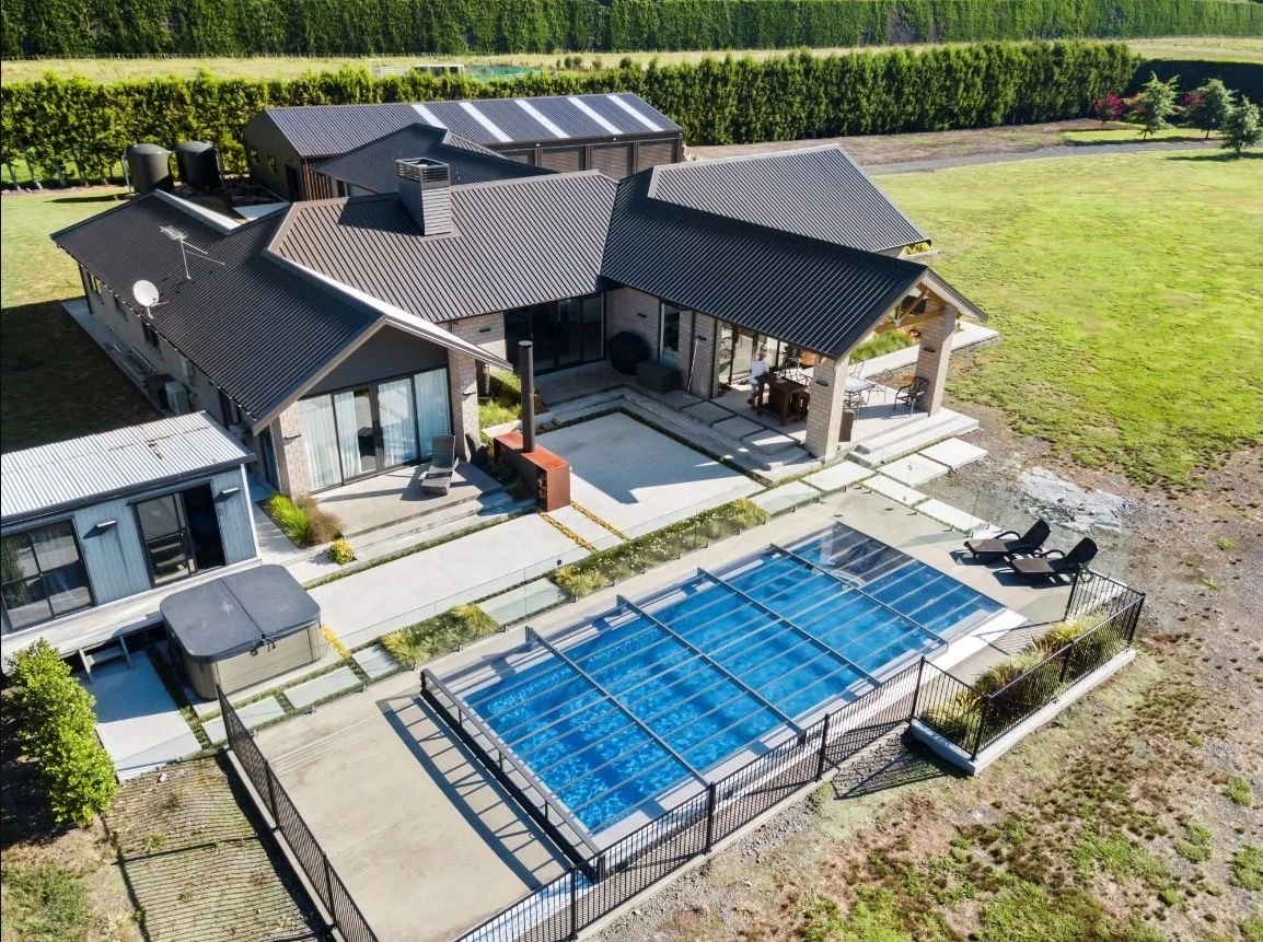 Pooltak RAVENA™ kombinerar vertikala väggar med välvda segment, vilket möjliggör fri rörelse runt tre sidor av poolen. Denna moderna design är idealisk för pooler placerade nära byggnader eller väggar.