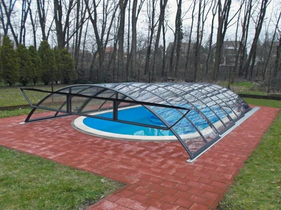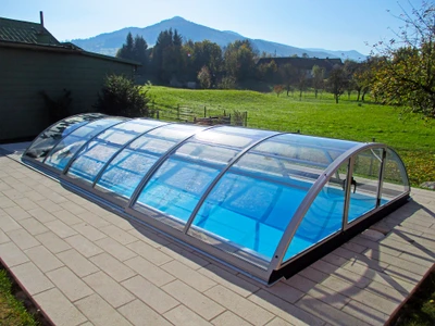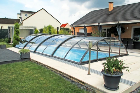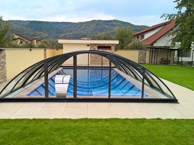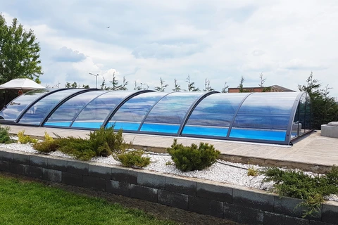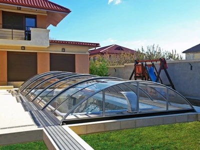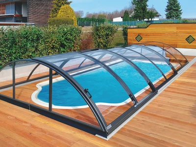 AZURE Flat Compact pooltak erbjuder den ideala kombinationen av funktionalitet och estetik för poolägare som söker en diskret men ändå effektiv lösning för poolsäkerhet. Tack vare användningen av flera radier har taket en flatare form med låg höjd, vilket minimerar den visuella påverkan på omgivningen. Höjden på taket varierar från 0,70 till 1,05 meter, vilket gör det möjligt att simma bekvämt under samtidigt som det ger tillräckligt skydd mot ogynnsamma väderförhållanden.