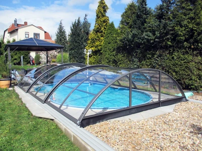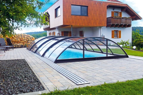 AZURE Compact pooltak är det perfekta valet för den som söker både elegans och funktionalitet. Den medelhöga konstruktionen gör det möjligt att röra sig bekvämt under taket utan att det upplevs skrymmande. Klart, kompakt polykarbonat ger ett modernt uttryck, maximal transparens och gör det lätt att hålla uppsikt över barn – eller helt enkelt njuta av utsikten över vattnet. Taket skyddar poolen mot smuts, hjälper till att bevara vattnets värme och förlänger badsäsongen avsevärt.