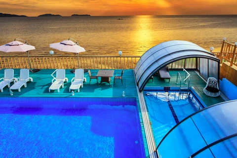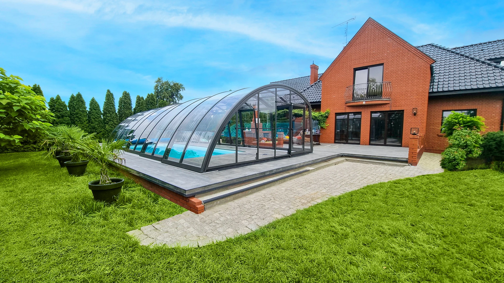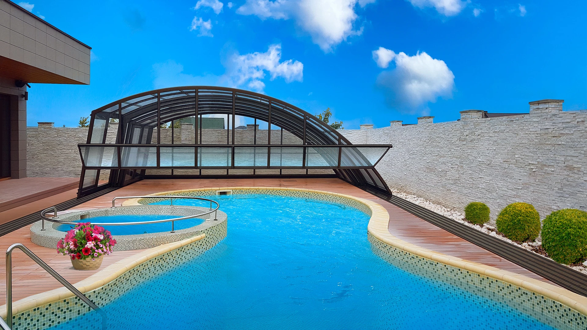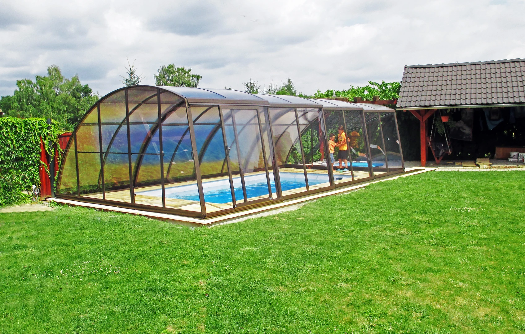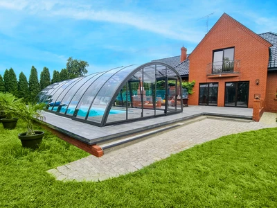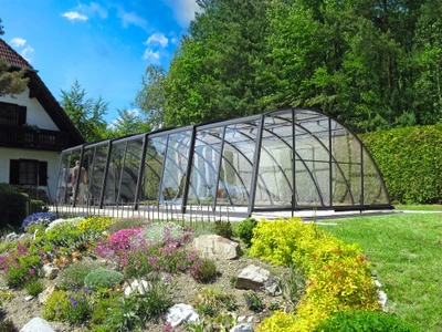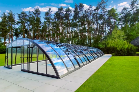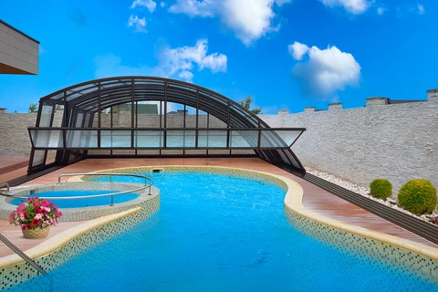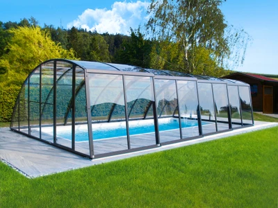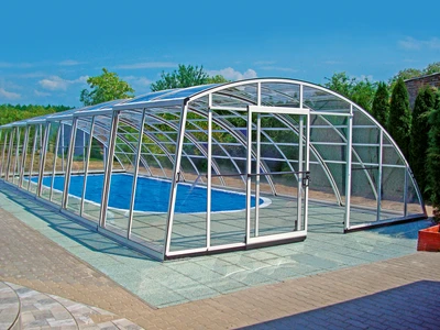 Pooltak VIVA™ från Alukov är en lågprofils-lösning med enkelspårssystem som möjliggör barriärfri åtkomst från tre sidor. Den moderna designen skyddar poolen från smuts, påskyndar uppvärmningen av vattnet och bibehåller temperaturen över natten.