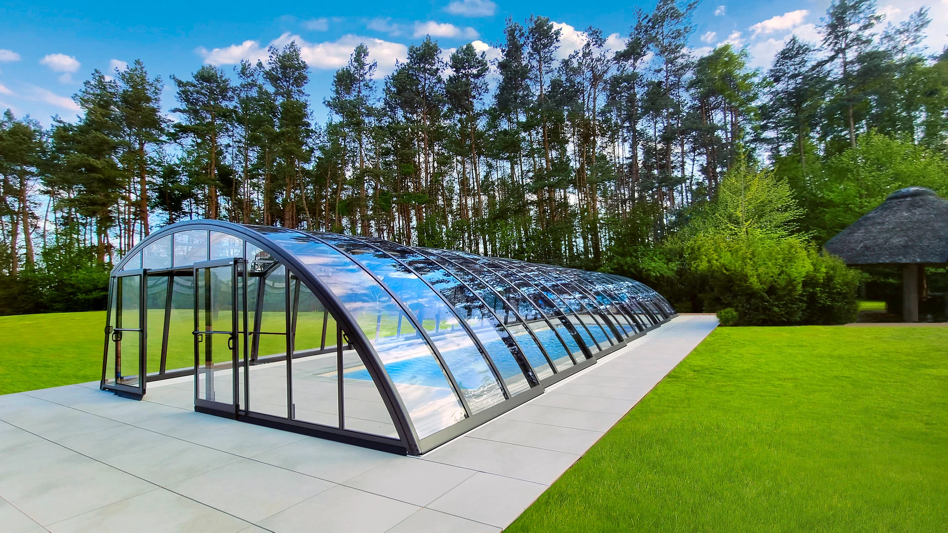 Pooltak AZURE™ är en medelhög lösning med elegant design, byggd med en enkel radie av aluminiumprofiler. Det erbjuder val av fyllning mellan enkelkammar- eller kompakt polykarbonat och finns i silver eller antracit.