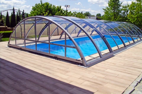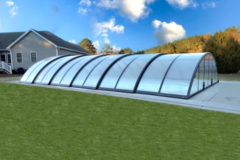Pooltak AZURE™ är en medelhög lösning med elegant design, byggd med en enkel radie av aluminiumprofiler. Det erbjuder val av fyllning mellan enkelkammar- eller kompakt polykarbonat och finns i silver eller antracit.