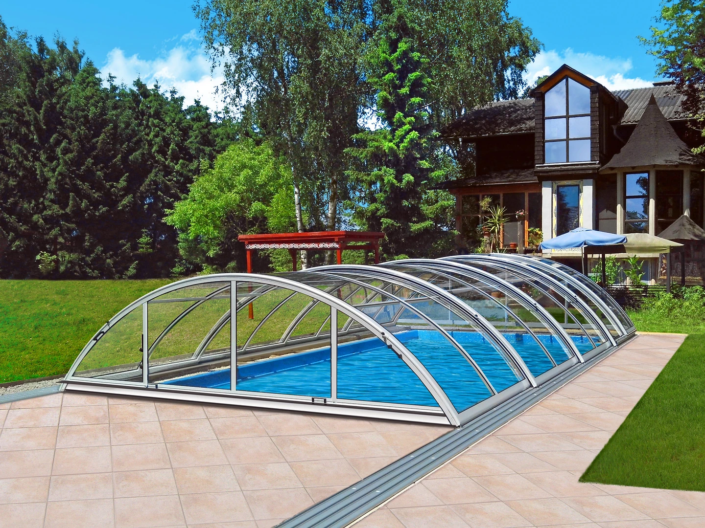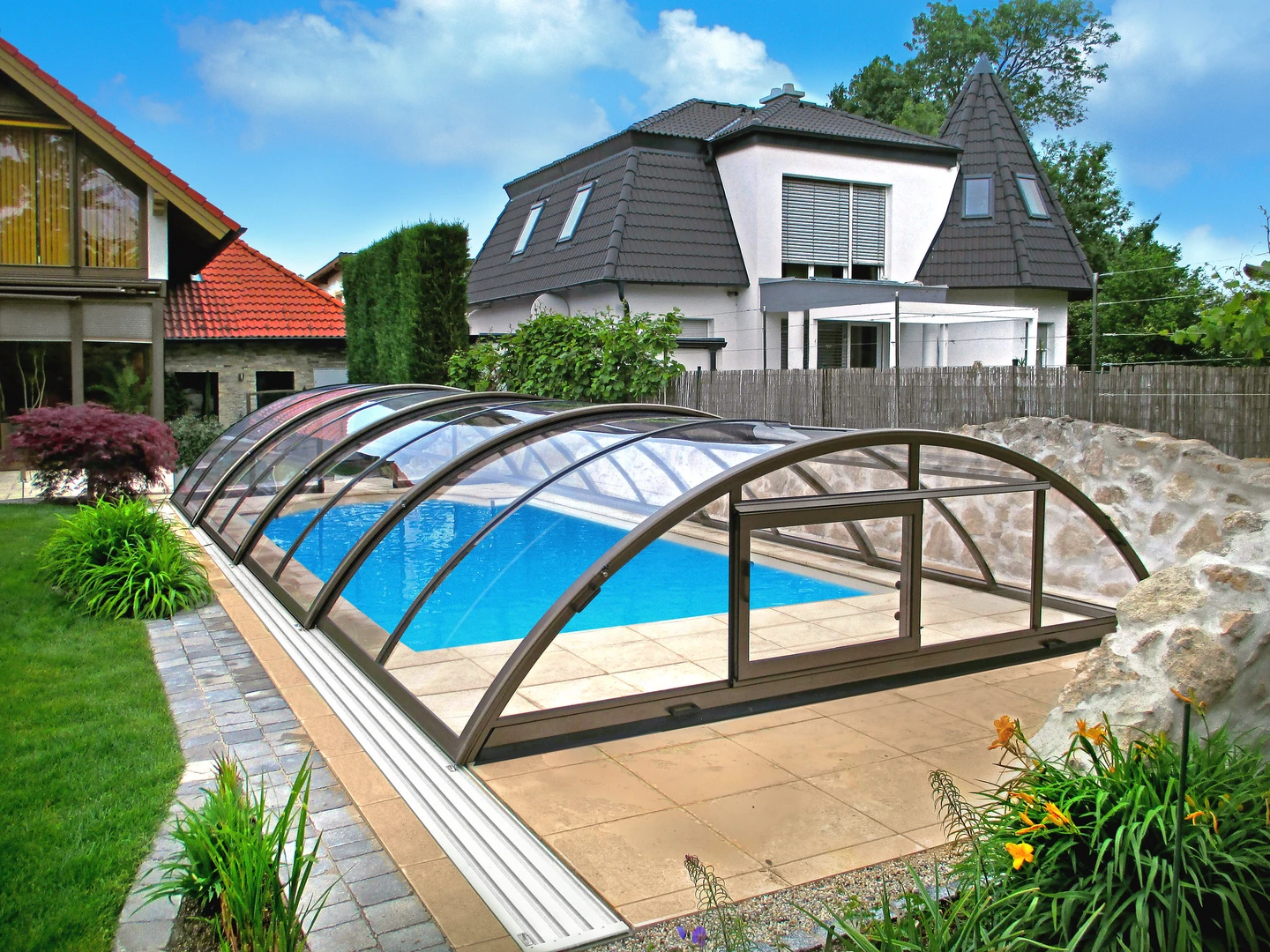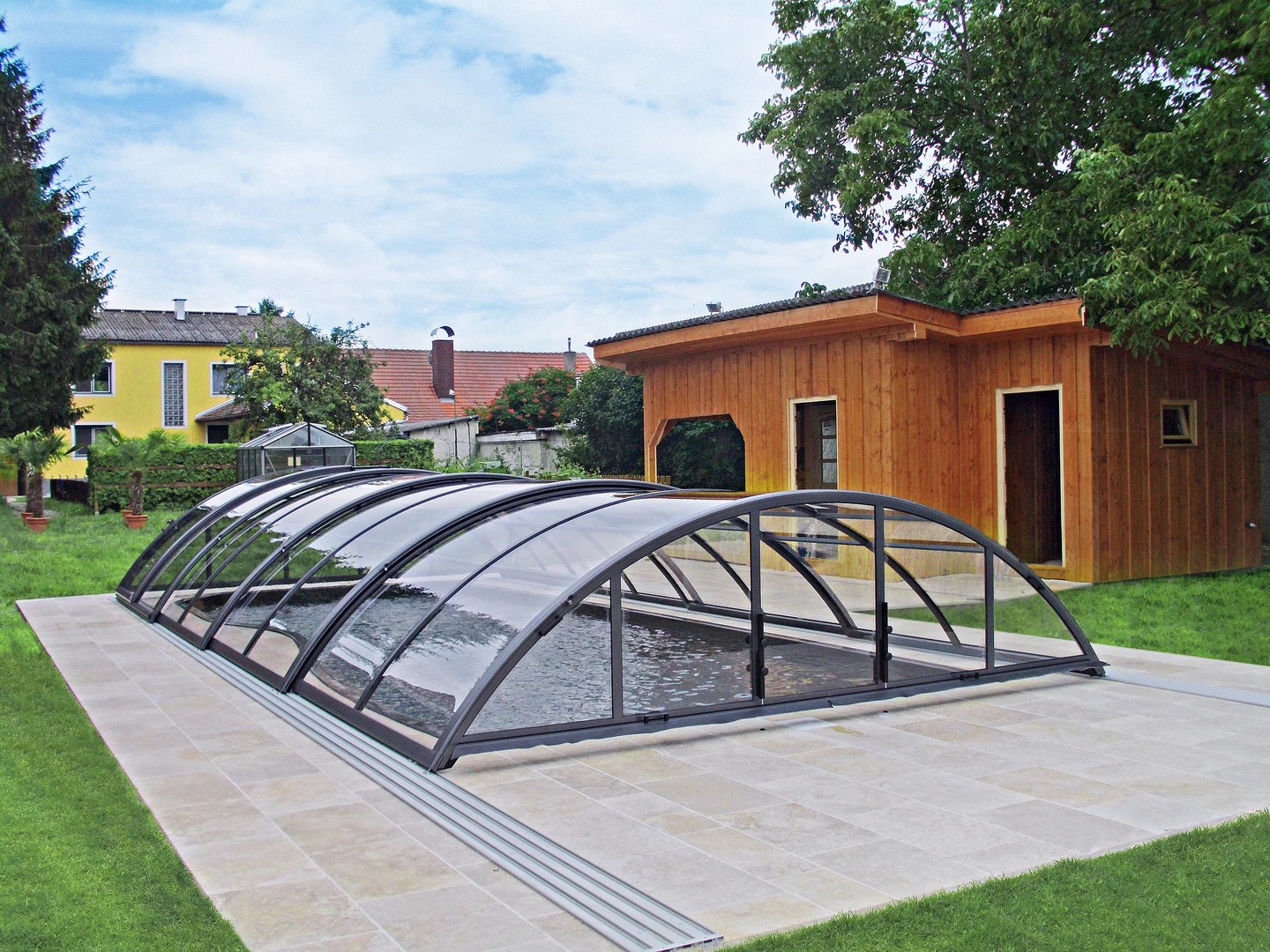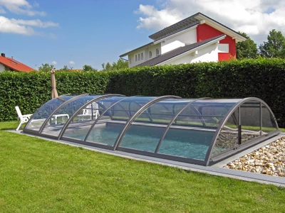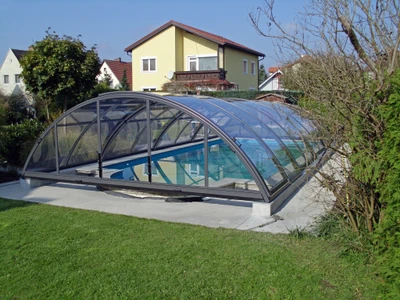 Pooltak VIVA™ från Alukov är en lågprofils-lösning med enkelspårssystem som möjliggör barriärfri åtkomst från tre sidor. Den moderna designen skyddar poolen från smuts, påskyndar uppvärmningen av vattnet och bibehåller temperaturen över natten.