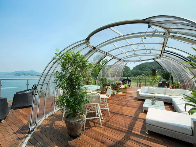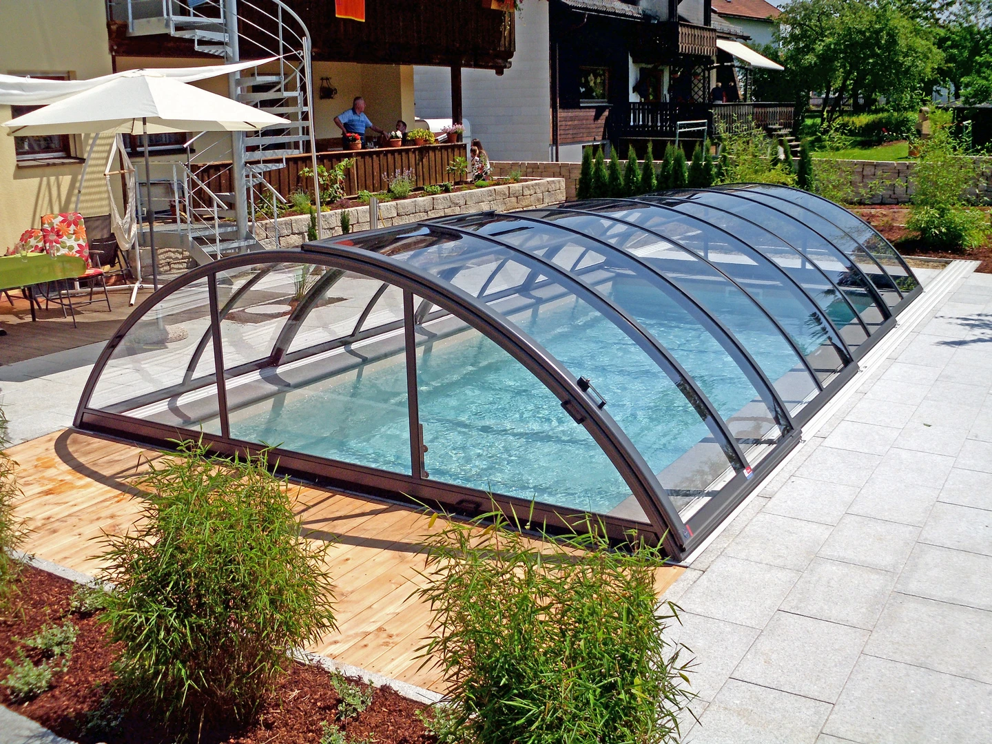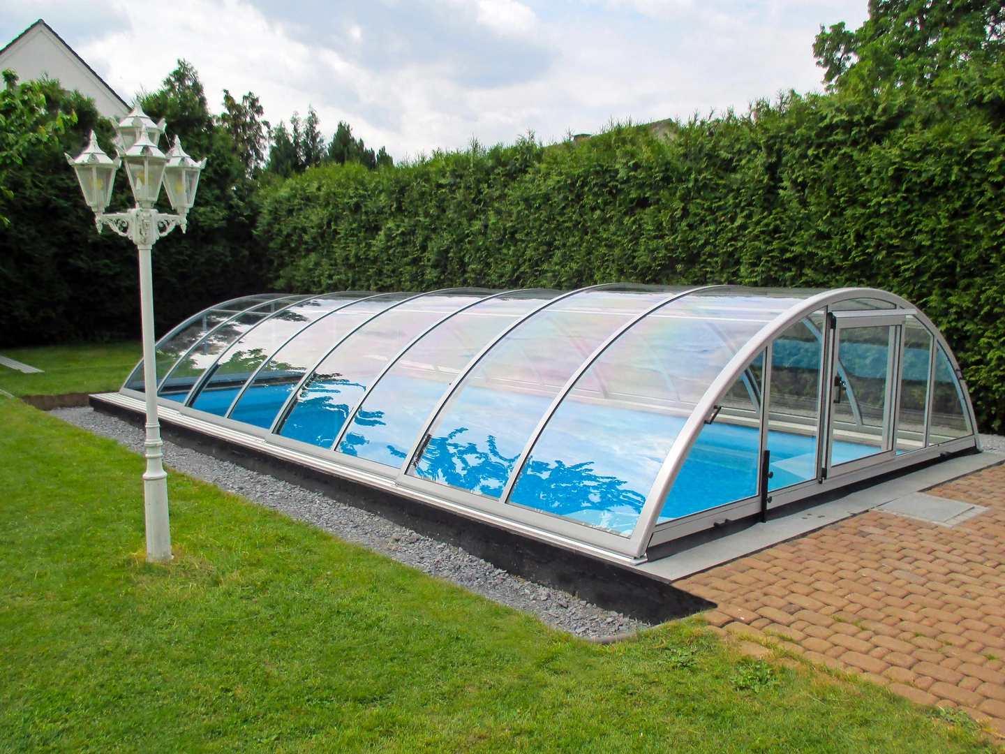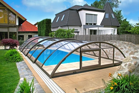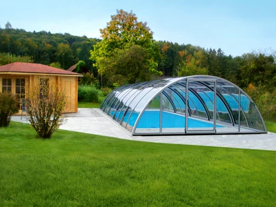 Pooltak VIVA™ från Alukov är en lågprofils-lösning med enkelspårssystem som möjliggör barriärfri åtkomst från tre sidor. Den moderna designen skyddar poolen från smuts, påskyndar uppvärmningen av vattnet och bibehåller temperaturen över natten.