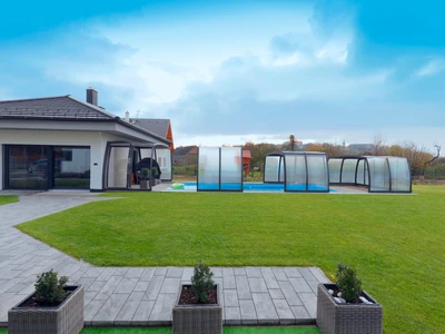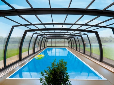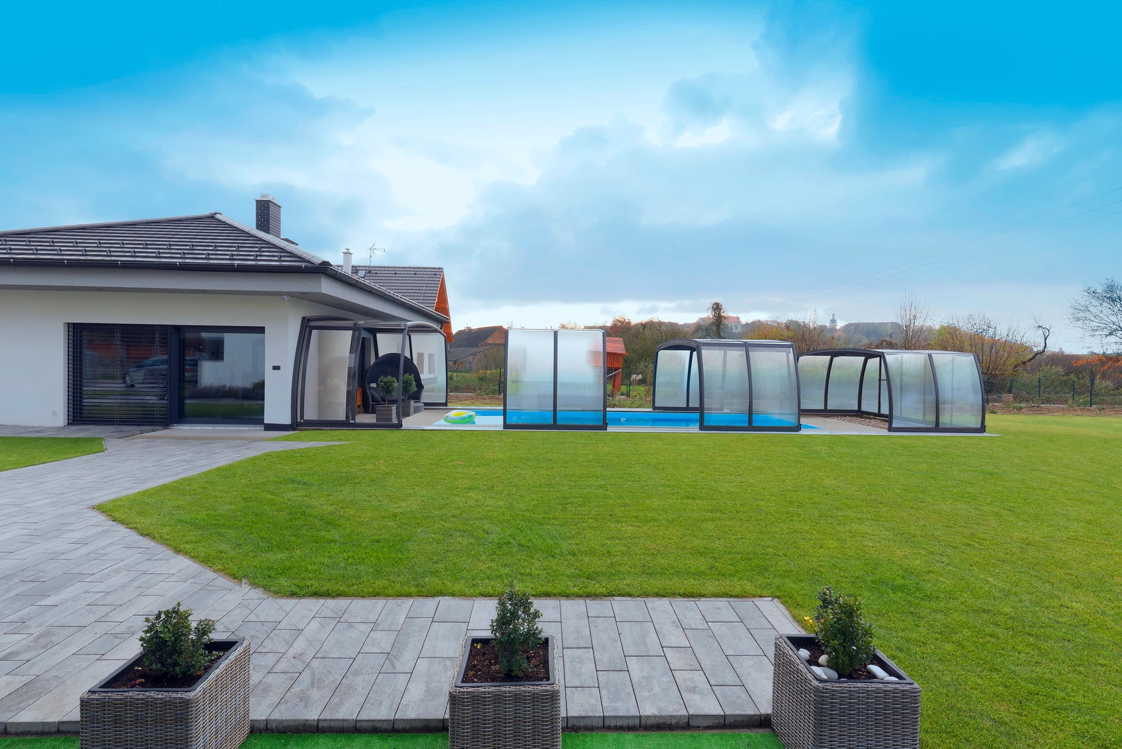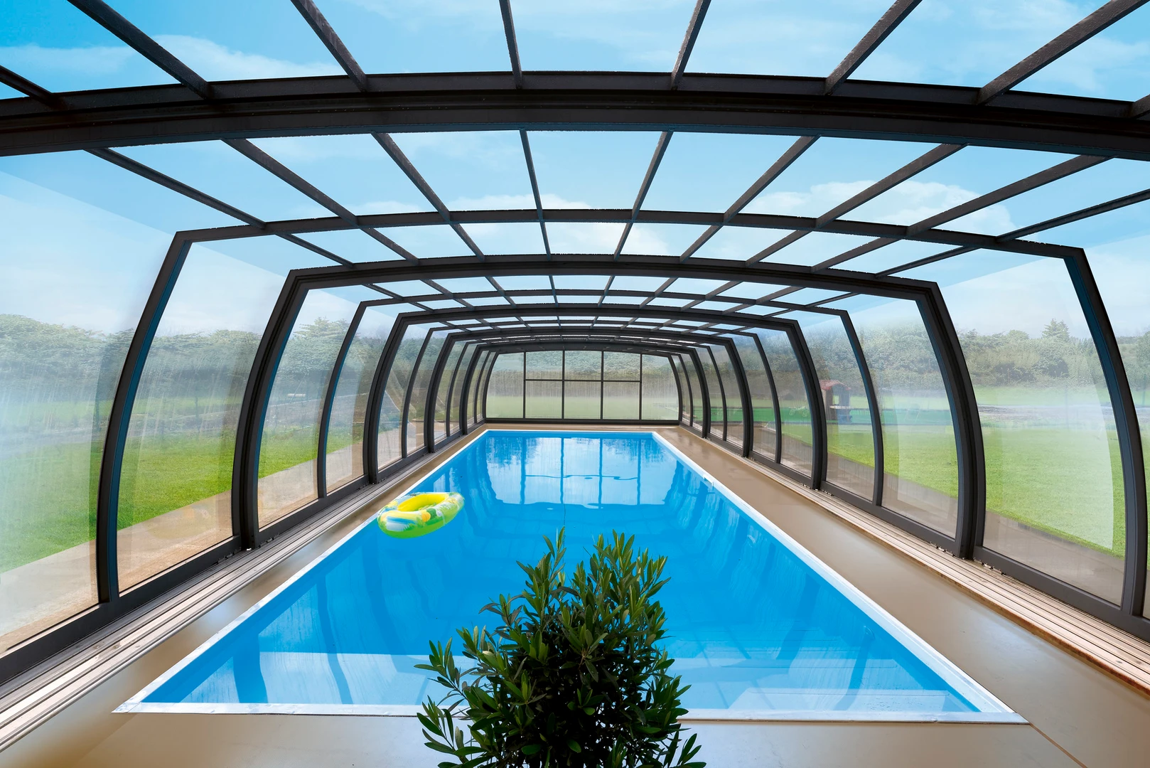 Pooltak OMEGA™ från Alukov har en unik design inspirerad av den grekiska bokstaven omega. Dess välvda sidoväggar skapar en fullt gångbar yta runt poolen samtidigt som trädgårdens estetik bevaras.