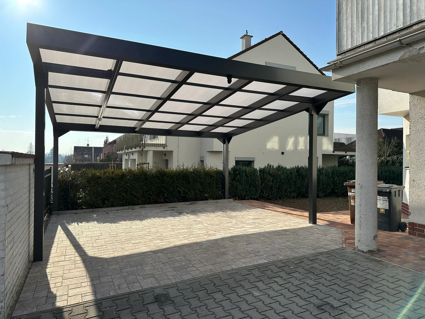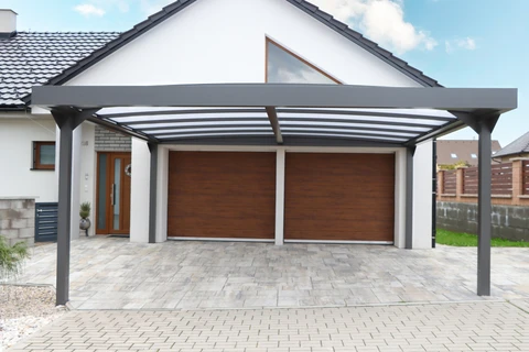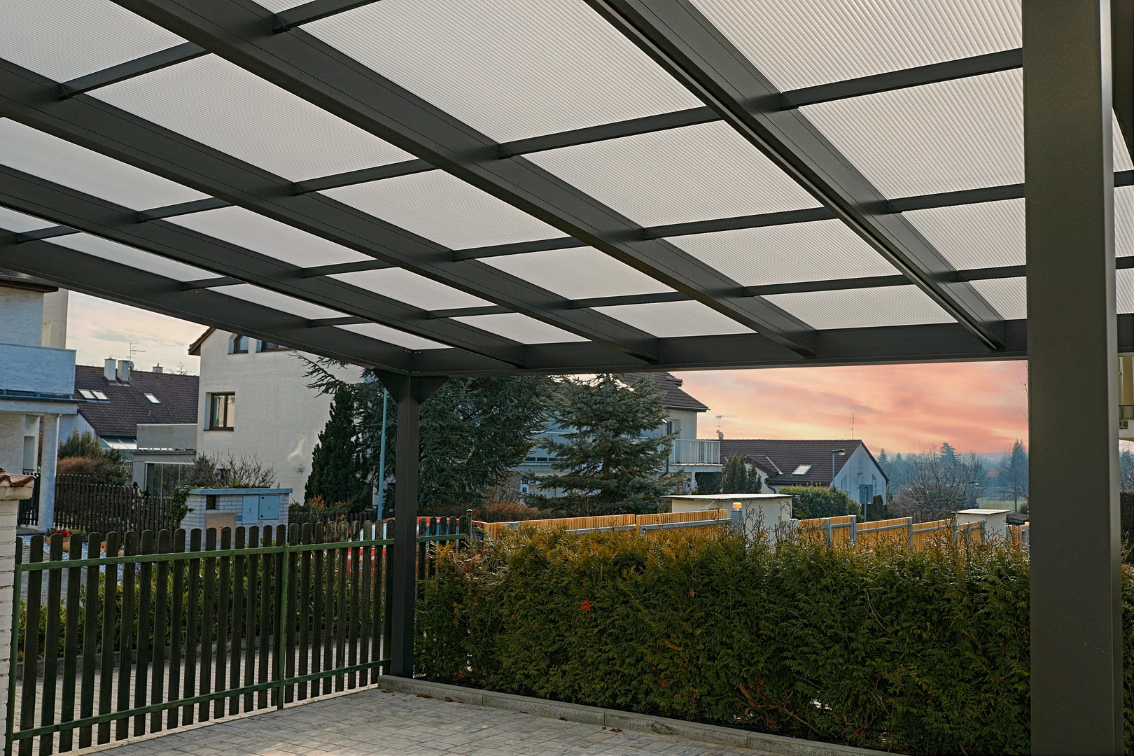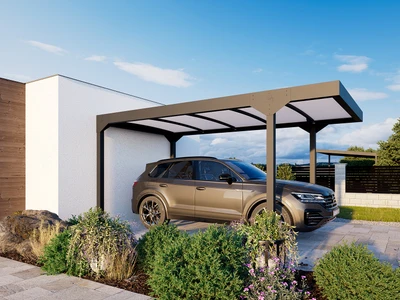 CARPORT CAMPER från Alukov är ett skydd som är speciellt utformat för att skydda husbilar mot hårt väder. Finns i tre storlekar (Standard, L, XL) och erbjuder en robust aluminiumstruktur med polykarbonattak som skyddar husbilen mot regn, snö och sol. Kan vara fristående eller anslutas till en byggnad.