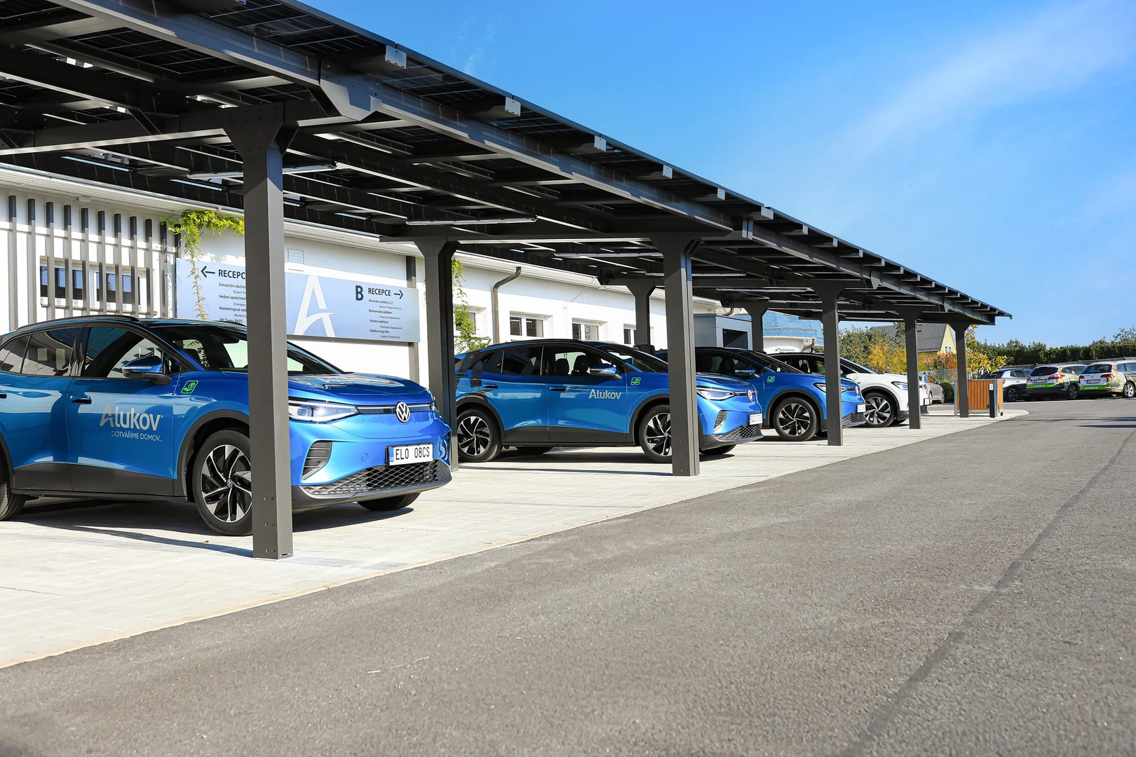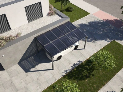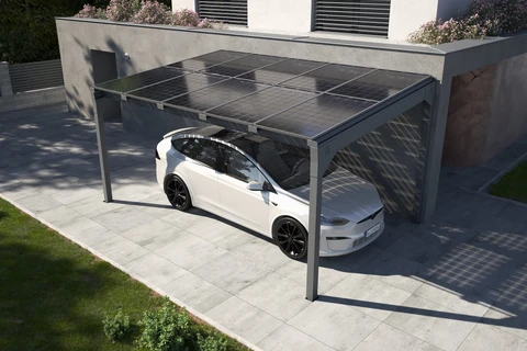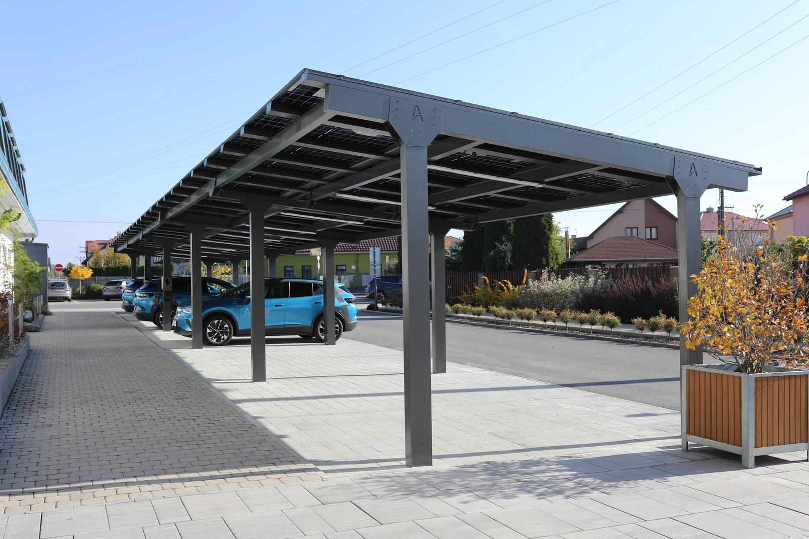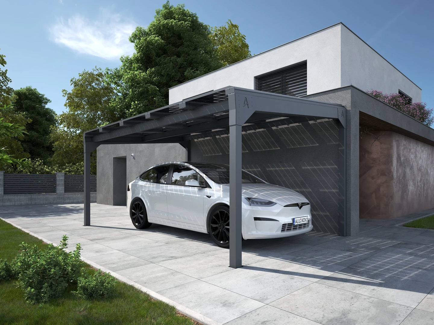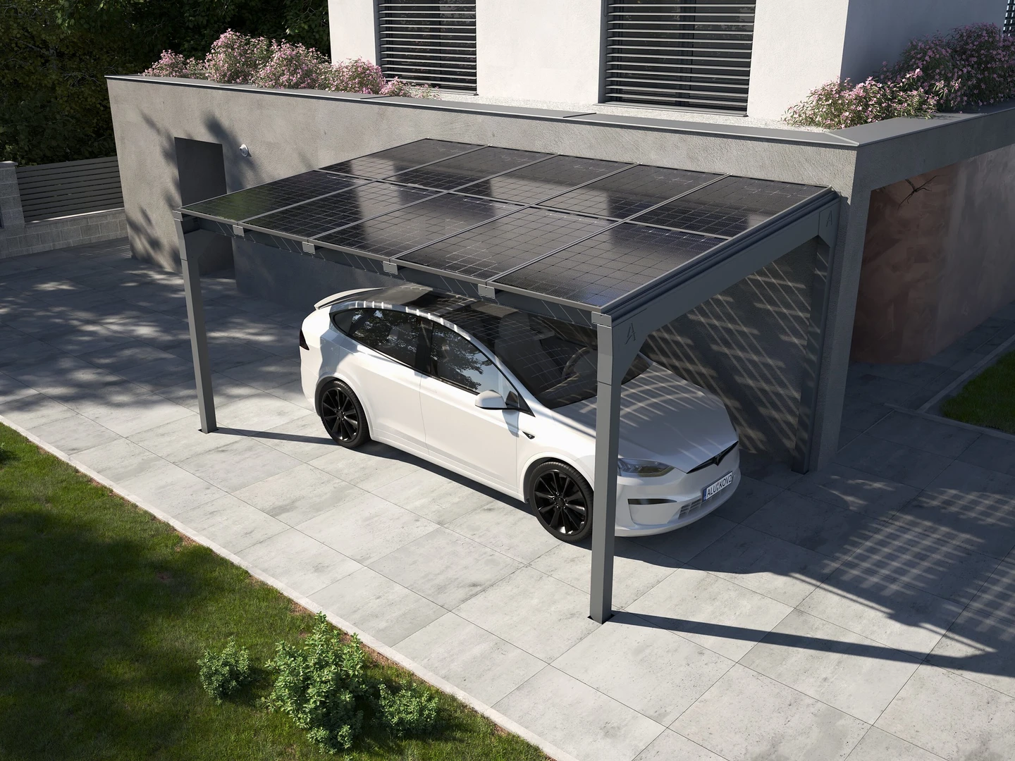 Carport Solar Premium är ett förstklassigt solskydd för ditt fordon, utrustat med ramlösa glas-glas-fotovoltaiska paneler. Det har elegant design, integrerade rännor och regnavledning. Singelvarianten med 9 paneler levererar 3,91 kWp, medan dubbelvarianten med 15 paneler når 6,52 kWp – tillräckligt för att ladda elfordon effektivt och minska energikostnaderna.