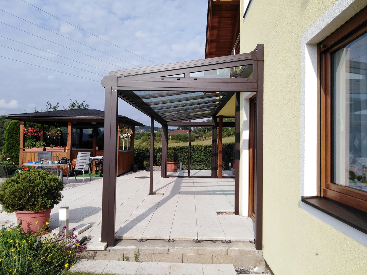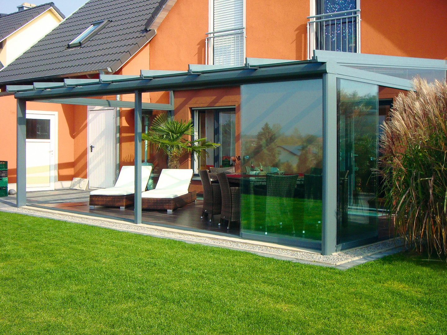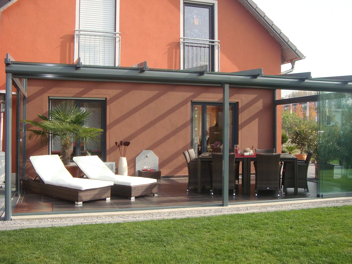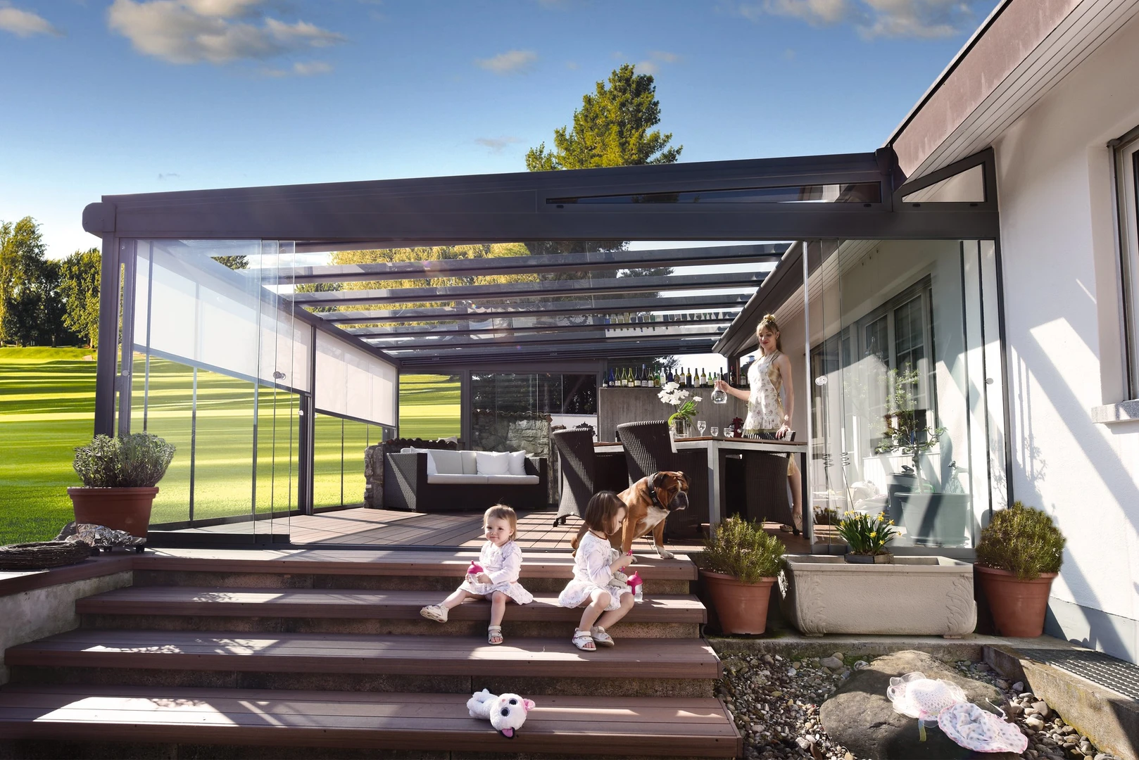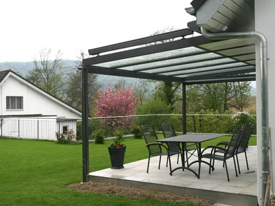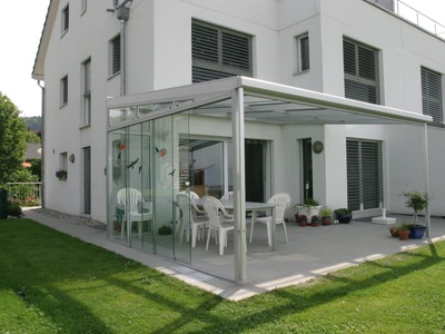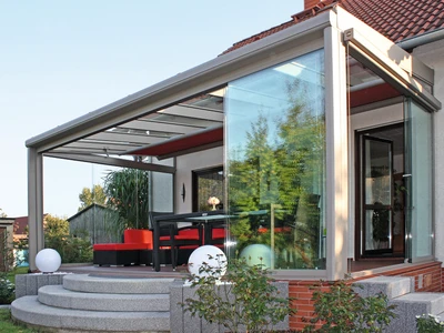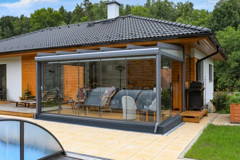 Uterum CORSO Solid – ett skjutbart system med aluminiumstruktur och polykarbonatpaneler för året-runt-användning av din terrass.