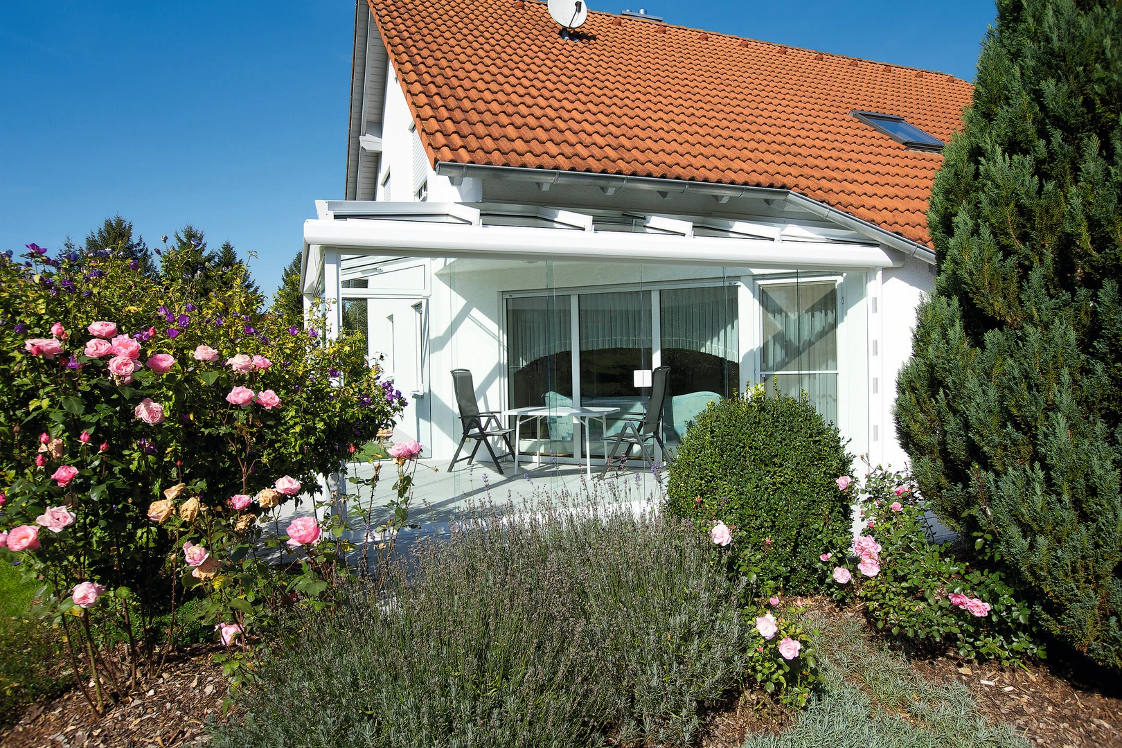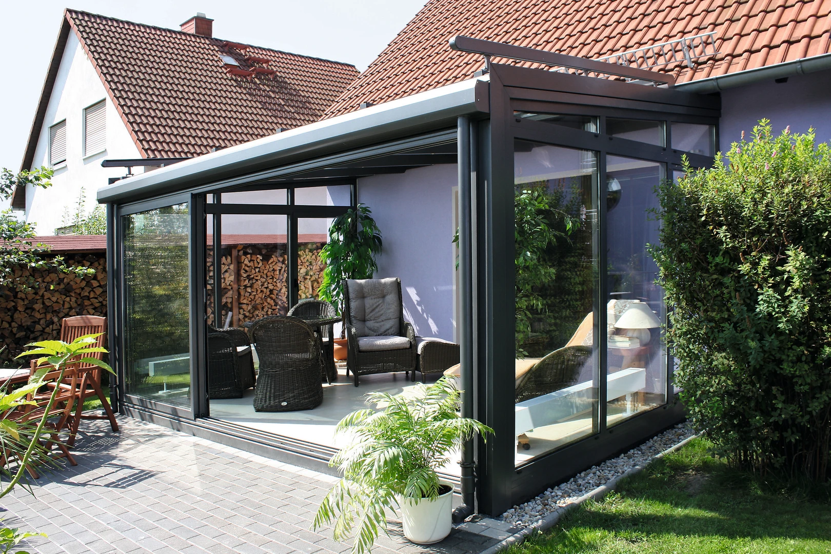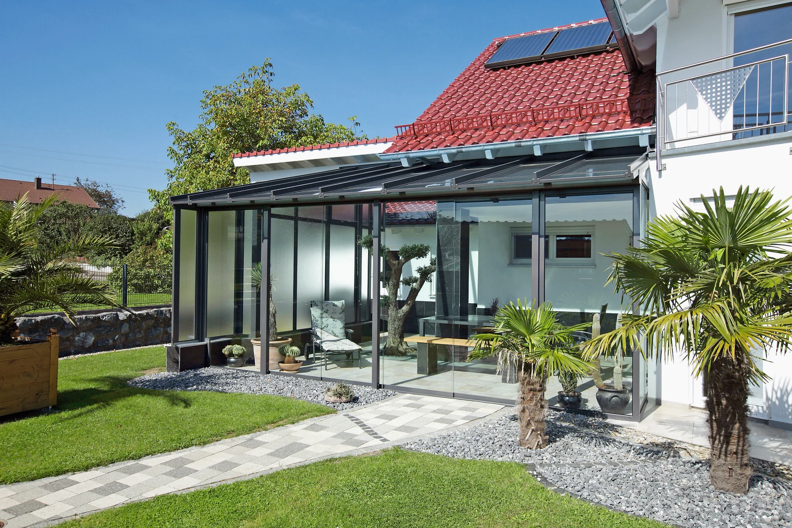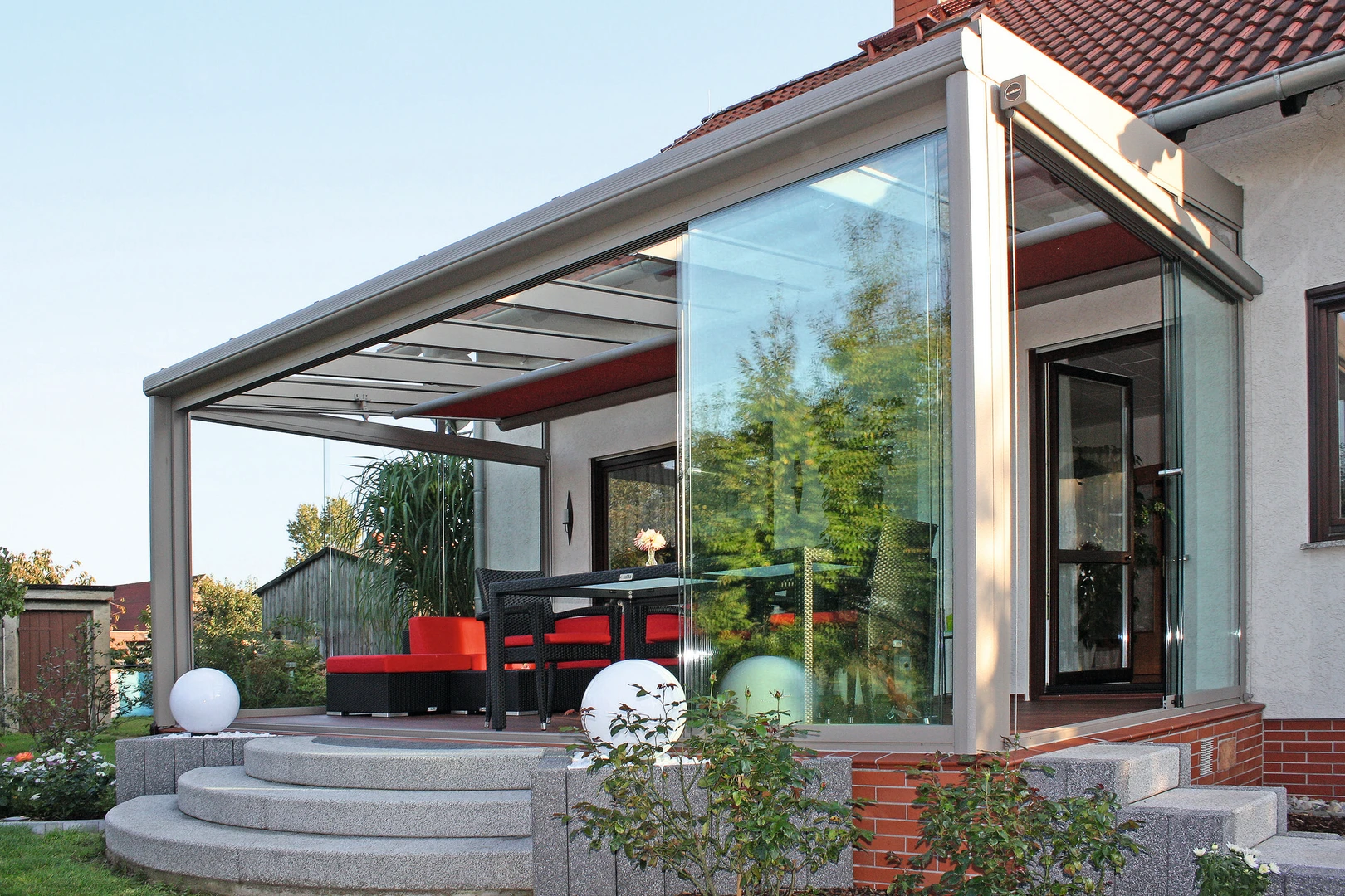 Det lyxiga skjutbara uterummet CORSO Premium från Alukov kombinerar en aluminiumstruktur, polykarbonattak och CONNEX 33.1 säkerhetsglas. Den eleganta designen och panoramautsikten ger året-runt-komfort och smidig hantering.
