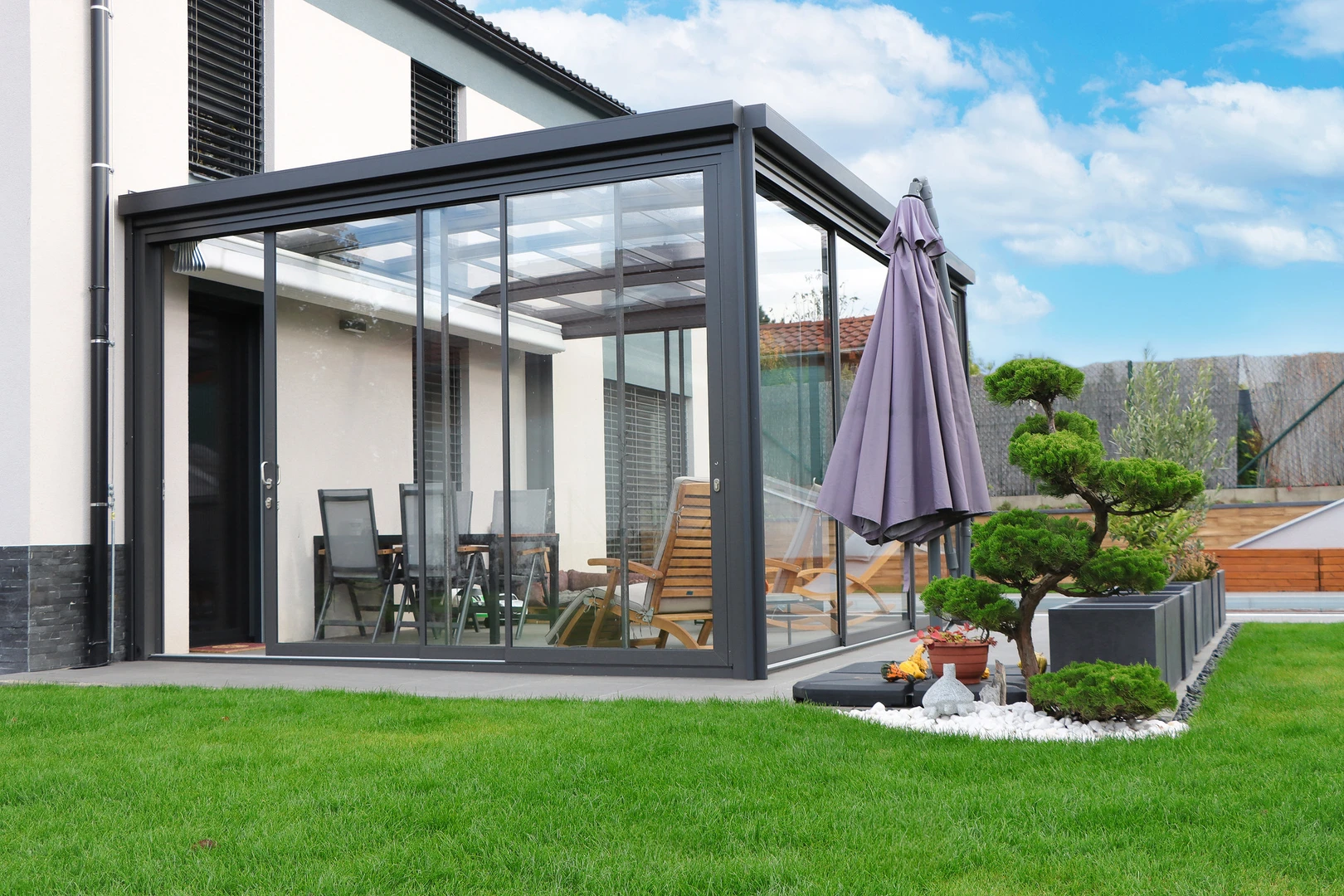 Pergola Venti är perfekt för att skapa ett utomhusvardagsrum, ett trädgårdskontor eller en stilfull matplats; den lämpar sig också för kommersiella miljöer som restauranger, caféer eller wellnessanläggningar och säkerställer en behaglig miljö året runt; tack vare sin mångsidighet passar den både stadshus, villor och företagsmiljöer.