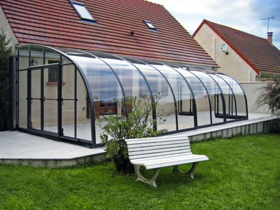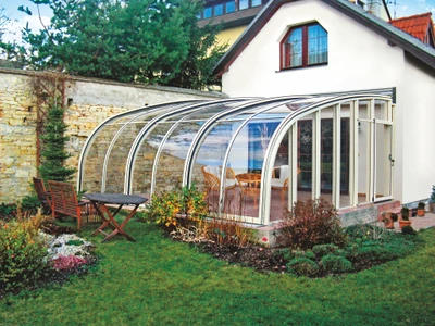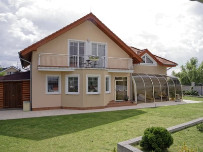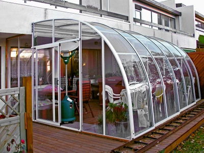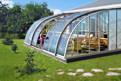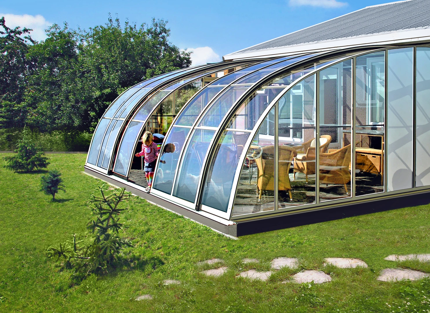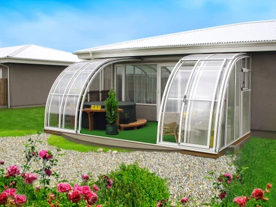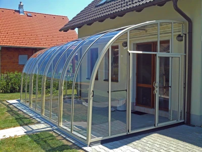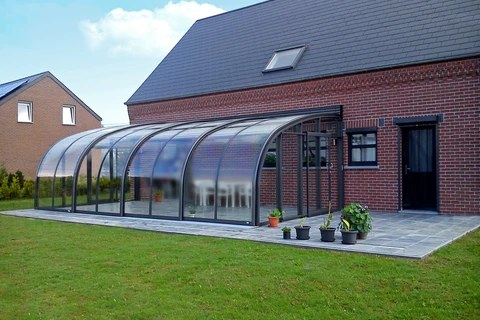 Uterum CORSO Solid – ett skjutbart system med aluminiumstruktur och polykarbonatpaneler för året-runt-användning av din terrass.