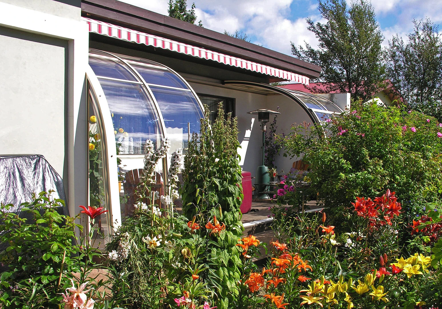 Det lyxiga skjutbara uterummet CORSO Premium från Alukov kombinerar en aluminiumstruktur, polykarbonattak och CONNEX 33.1 säkerhetsglas. Den eleganta designen och panoramautsikten ger året-runt-komfort och smidig hantering.