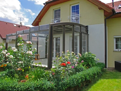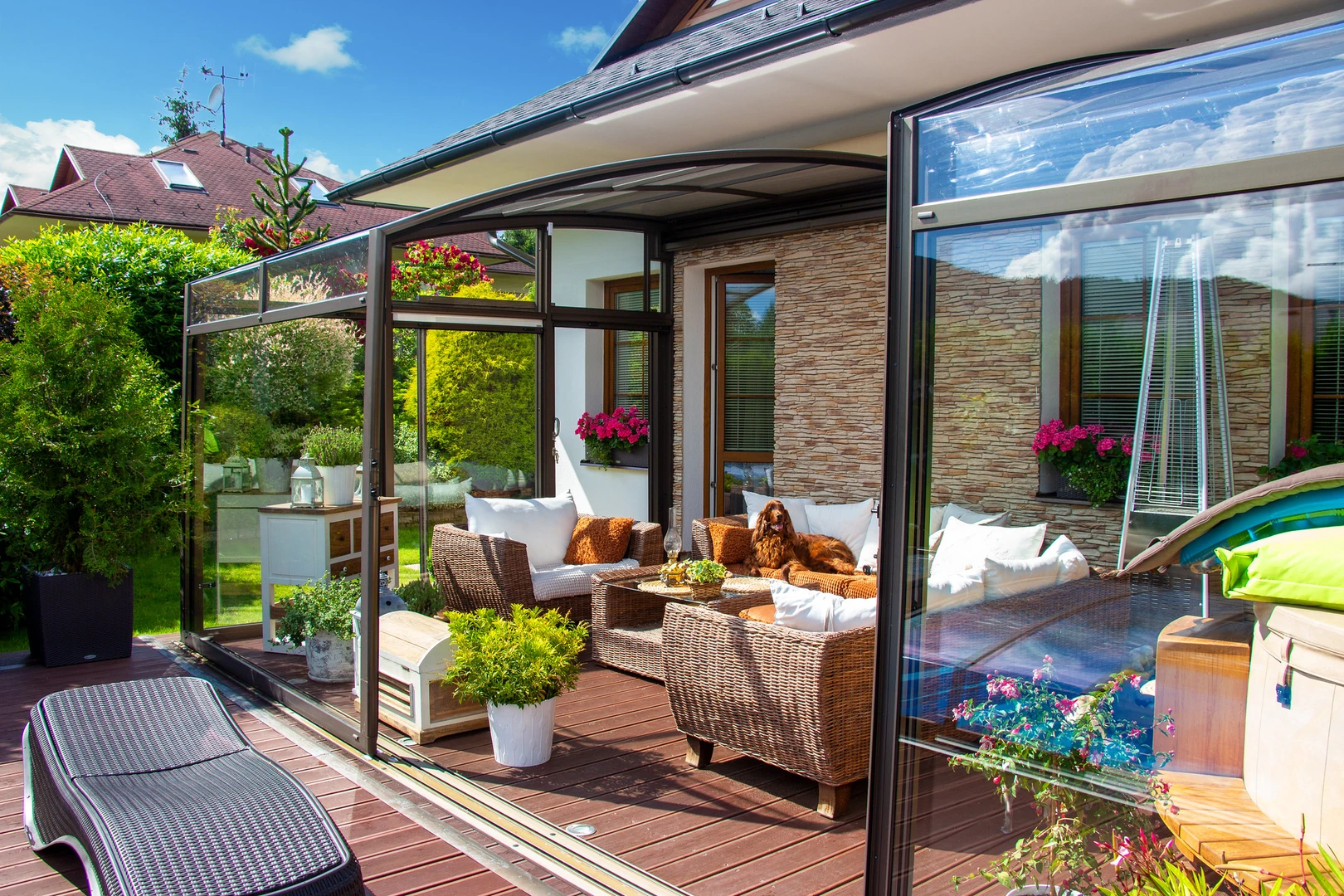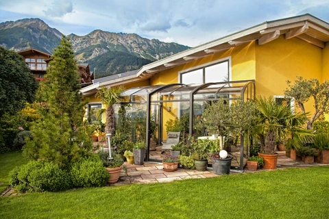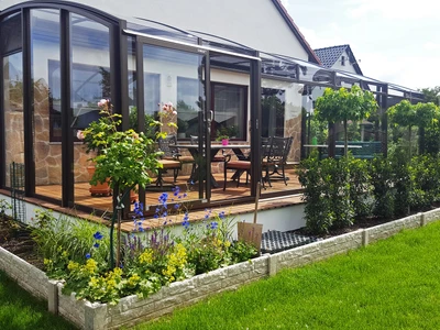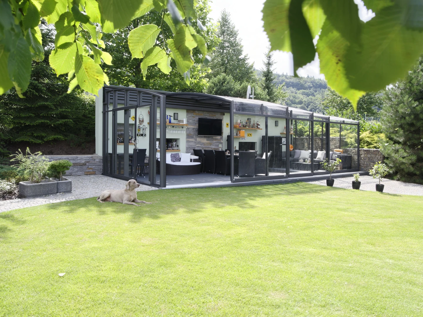 Upptäck det skjutbara uterummet CORSO Entry – den perfekta lösningen för året-runt-användning av din terrass eller balkong med polykarbonattak och aluminiumram.