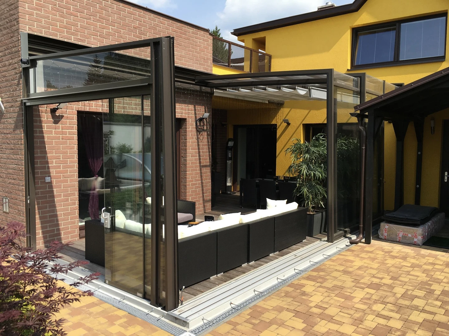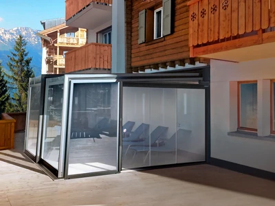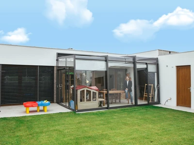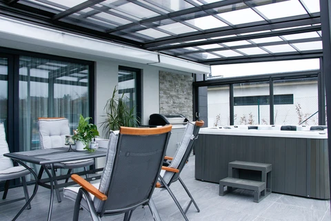 Uterum CORSO Solid – ett skjutbart system med aluminiumstruktur och polykarbonatpaneler för året-runt-användning av din terrass.