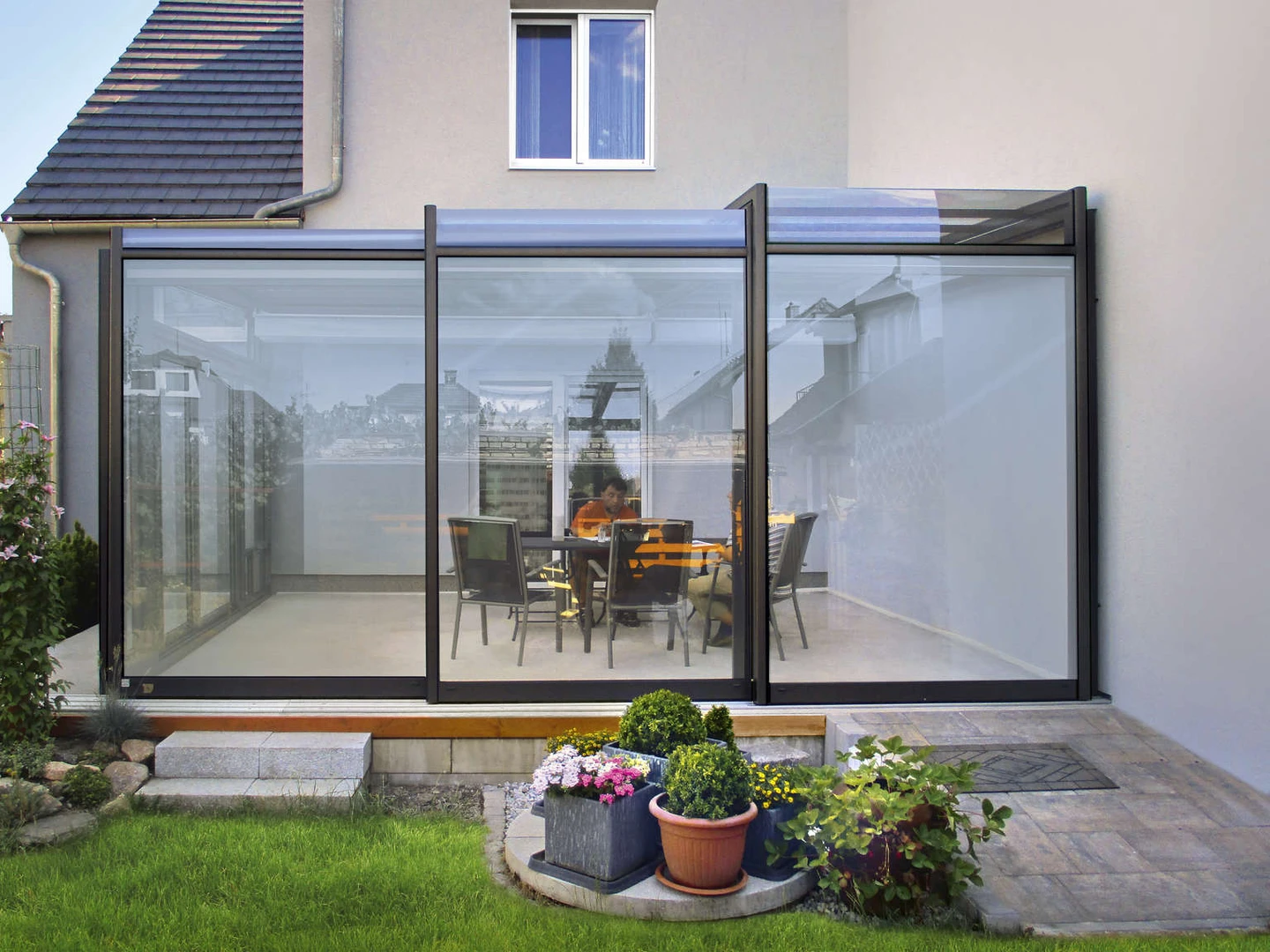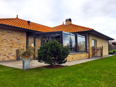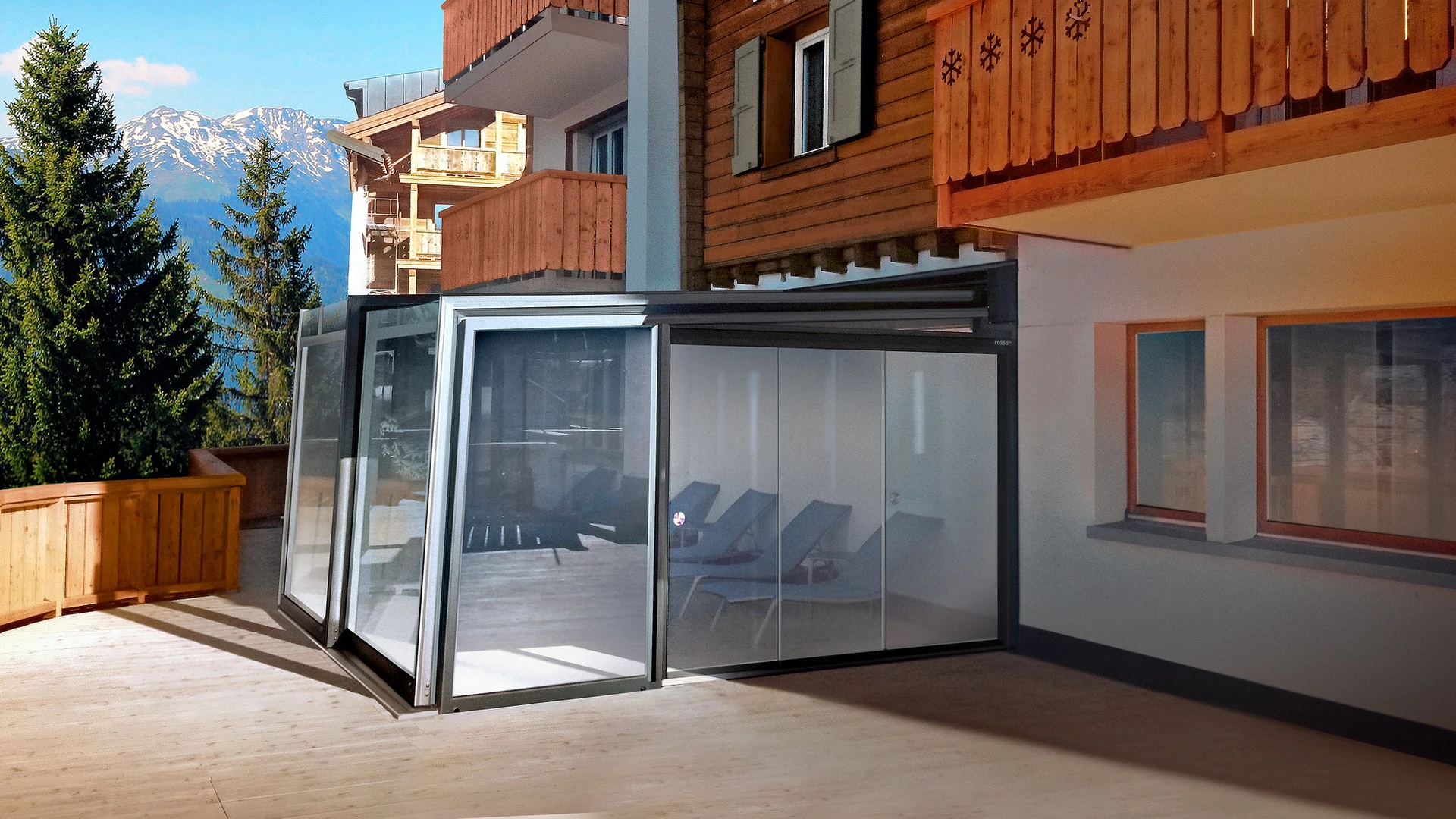 Det lyxiga skjutbara uterummet CORSO Premium från Alukov kombinerar en aluminiumstruktur, polykarbonattak och CONNEX 33.1 säkerhetsglas. Den eleganta designen och panoramautsikten ger året-runt-komfort och smidig hantering.