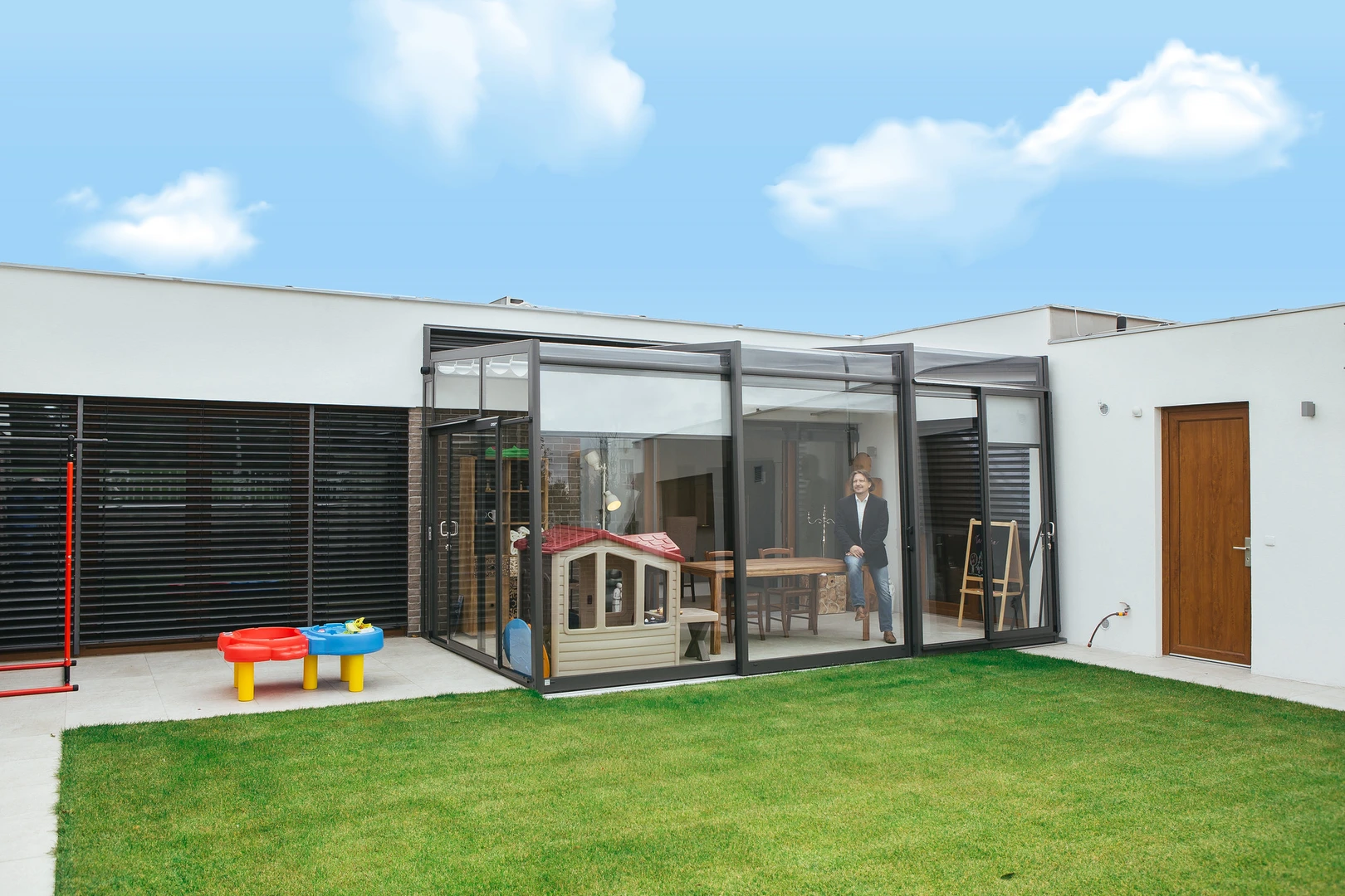 Juvelen bland uterum – det helglasade skjutbara CORSO GLASS, belönat med GRAND PRIX på For Arch-mässan. Hantverk av högsta kvalitet, tidlös design, robust struktur och smidig segmentförskjutning imponerade både experter och publik.